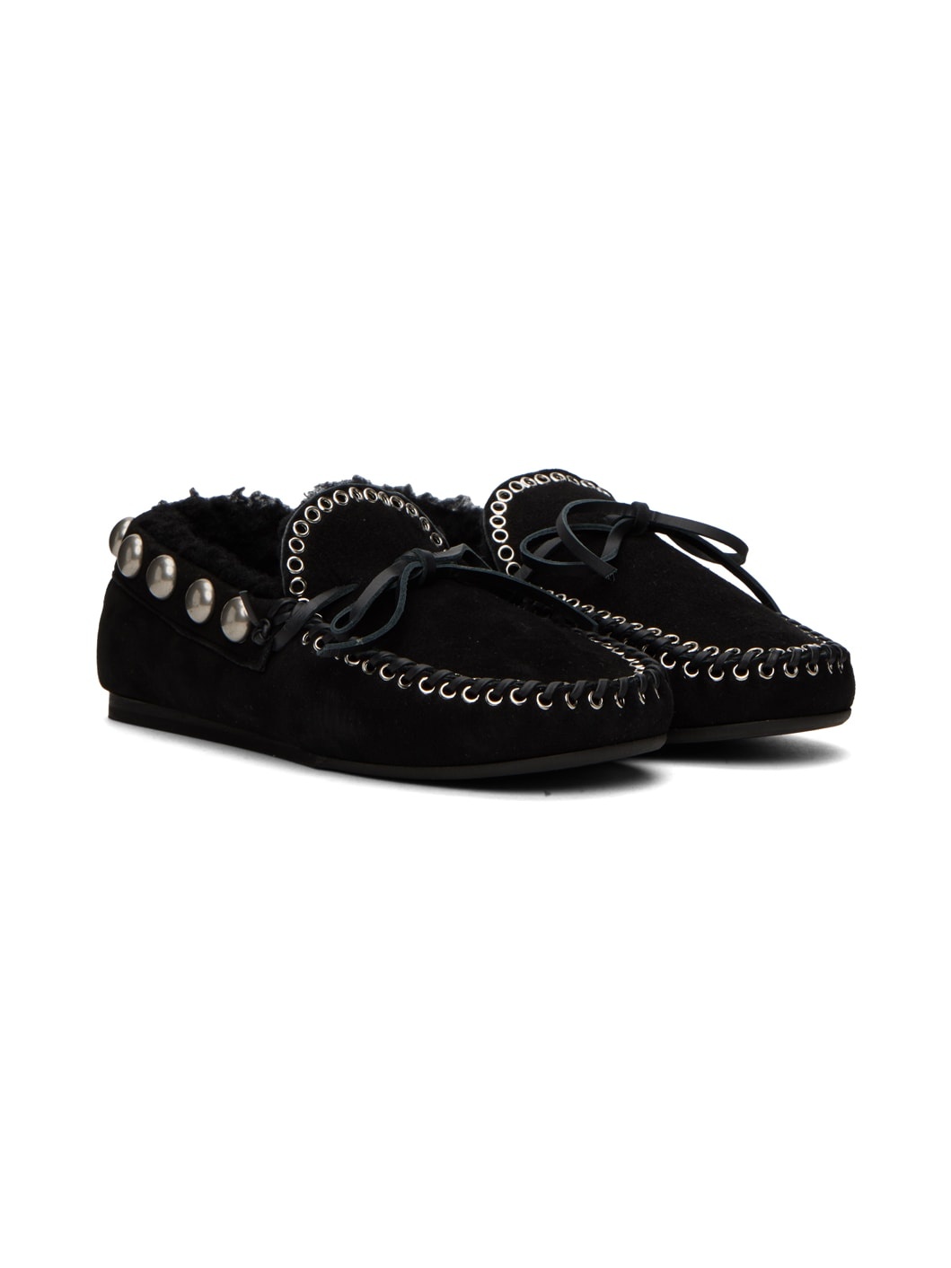 Sheepskin suede loafers in black. Eyelets throughout. · Round moc toe · Self-tie leather strap at vamp · Studs at collar · Shearling lining in white · Rubber sole Supplier color: Black Upper: sheepskin. Sole: thermoplastic polyurethane.