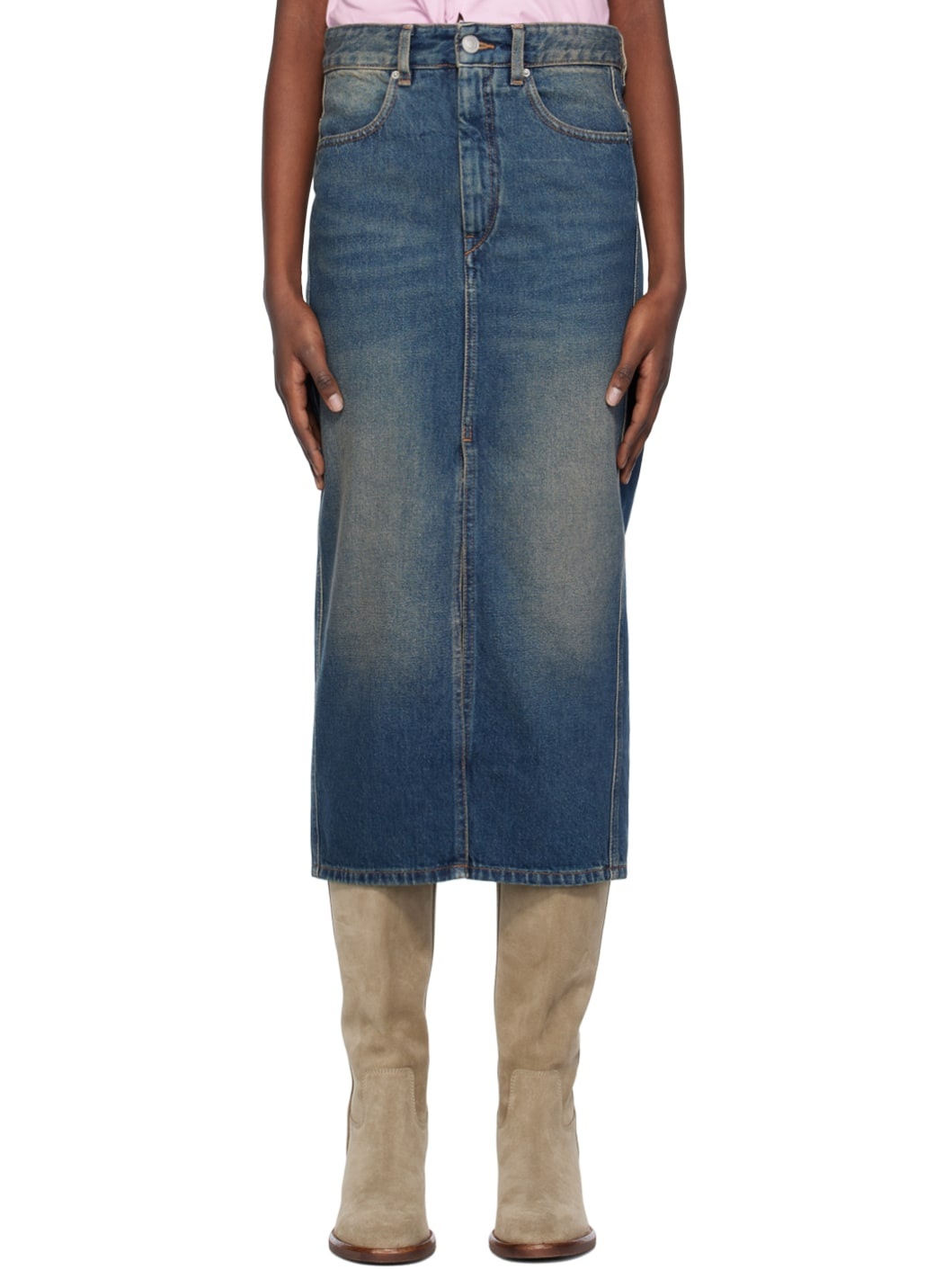 Non-stretch denim skirt. Fading and whiskering throughout. · Belt loops · Four-pocket styling · Zip-fly · Vented front hem · Logo patch at back waistband · Contrast stitching in tan Supplier color: Faded blue Body: 100% cotton. Lining: 65% polyester, 35% cotton. Made in Tunisia 241600F092001