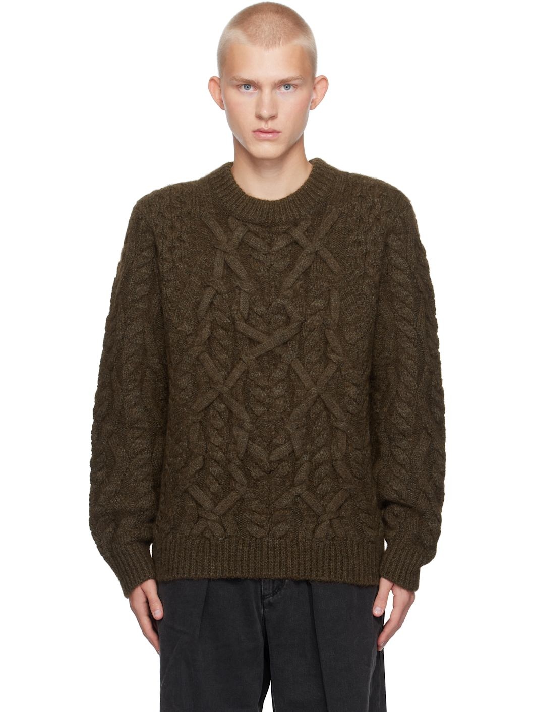 Cable-knit virgin wool-blend sweater. · Rib-knit crewneck, hem, and cuffs · Dropped shoulders Supplier color: Bronze 54% virgin wool, 18% polyamide, 12% acrylic, 11% alpaca, 5% wool. Made in Italy 242600M201022