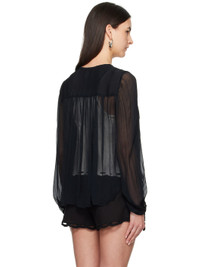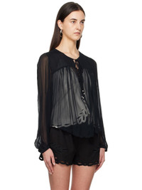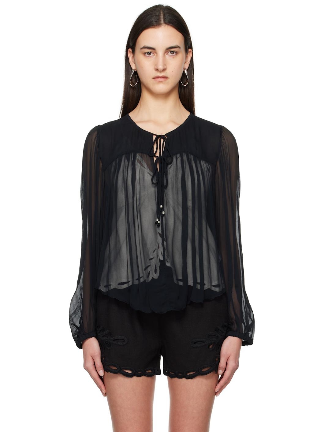Lightweight semi-sheer viscose gauze blouse. Gathering throughout. · Round neck · Self-tie fastening at chest · Raw edge at curved hem · Elasticized cuffs Supplier color: Faded black 100% viscose. Made in India 251599F107019
