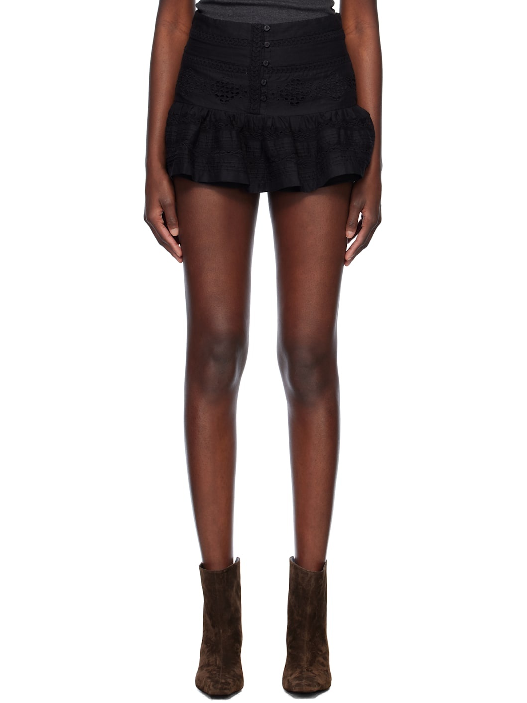 Cotton voile miniskirt. Lace trim and embroidered detailing throughout. · Button closure · Gathering at flared hem · Integrated short-style underlay Supplier color: Black Body: 100% cotton. Lining: 100% cotton. Made in India 251599F090008