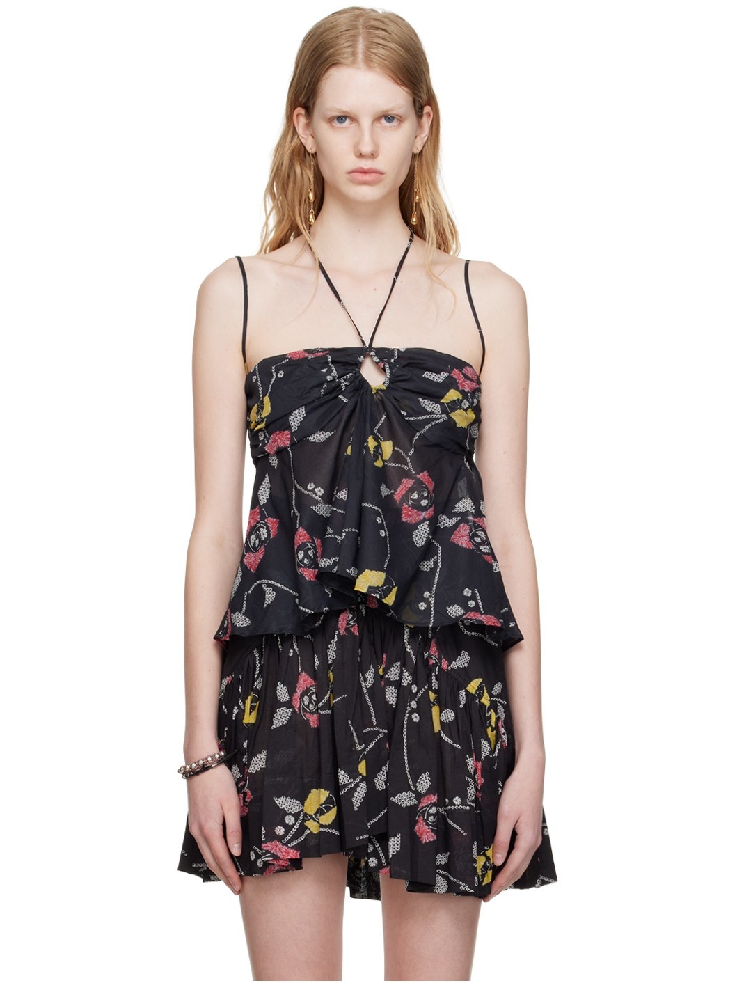 Semi-sheer organic cotton voile tank top. Floral pattern printed throughout. · Self-tie halter strap at keyhole neck · Fixed spaghetti straps · Zip closure at back · Partially lined Supplier color: Black 100% organic cotton. Made in India 231599F111004