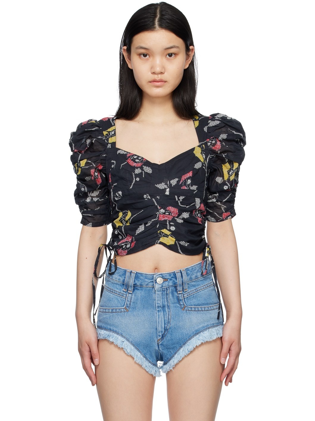 Plain-woven cotton blouse. Gathering and floral pattern printed throughout. · Sweetheart neck · Cropped hem · Drawstring and ruching at side seams · Shirring at puff sleeves · Zip closure at back · Fully lined Supplier color: Black 100% cotton. Made in India 231599F107000
