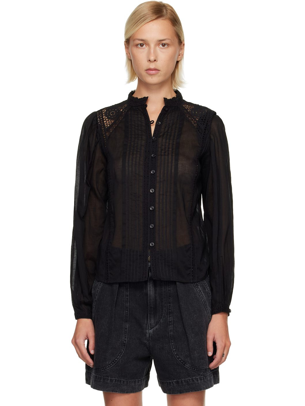 GOTS-certified organic cotton poplin blouse. · Lace trim throughout · Band collar · Button closure · Tucks at front · Shirttail hem · Gathering at cuffs and back yoke · Button fastening at cuffs Supplier color: Black 100% cotton. Made in India 252599F107007