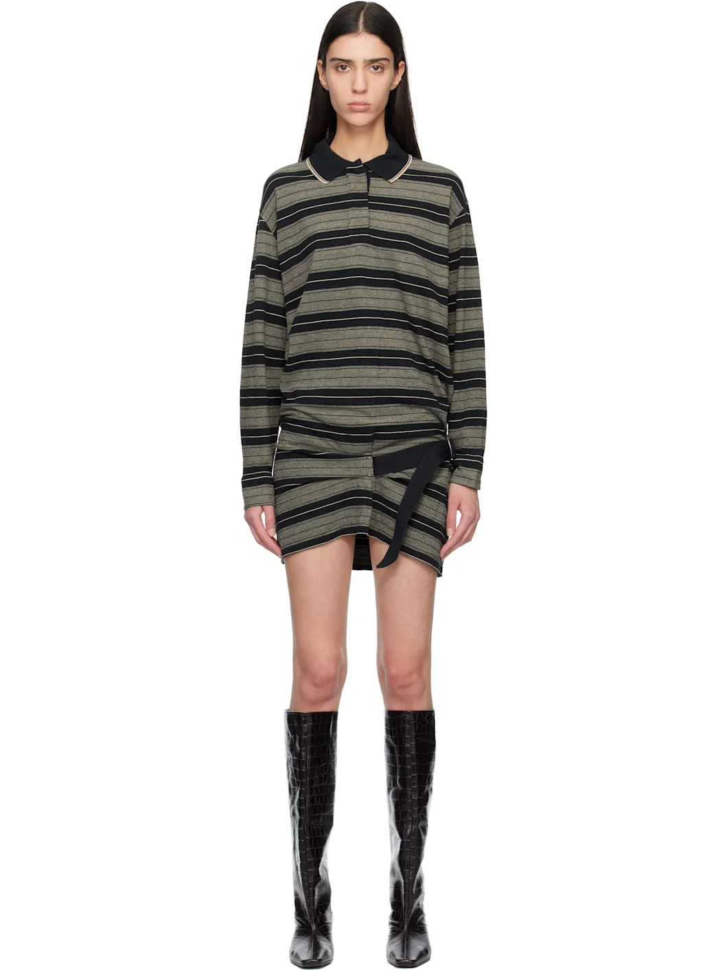 Organic cotton pique minidress. · Stripes throughout · Rib-knit spread collar · Concealed three-button placket · Gathering and adjustable offset cinch tab at waist · Buttoned barrel cuffs · Logo embroidered at back collar · Inverted box pleat at back Supplier color: Black/Ecru 100% cotton. Made in Morocco 261599F052006
