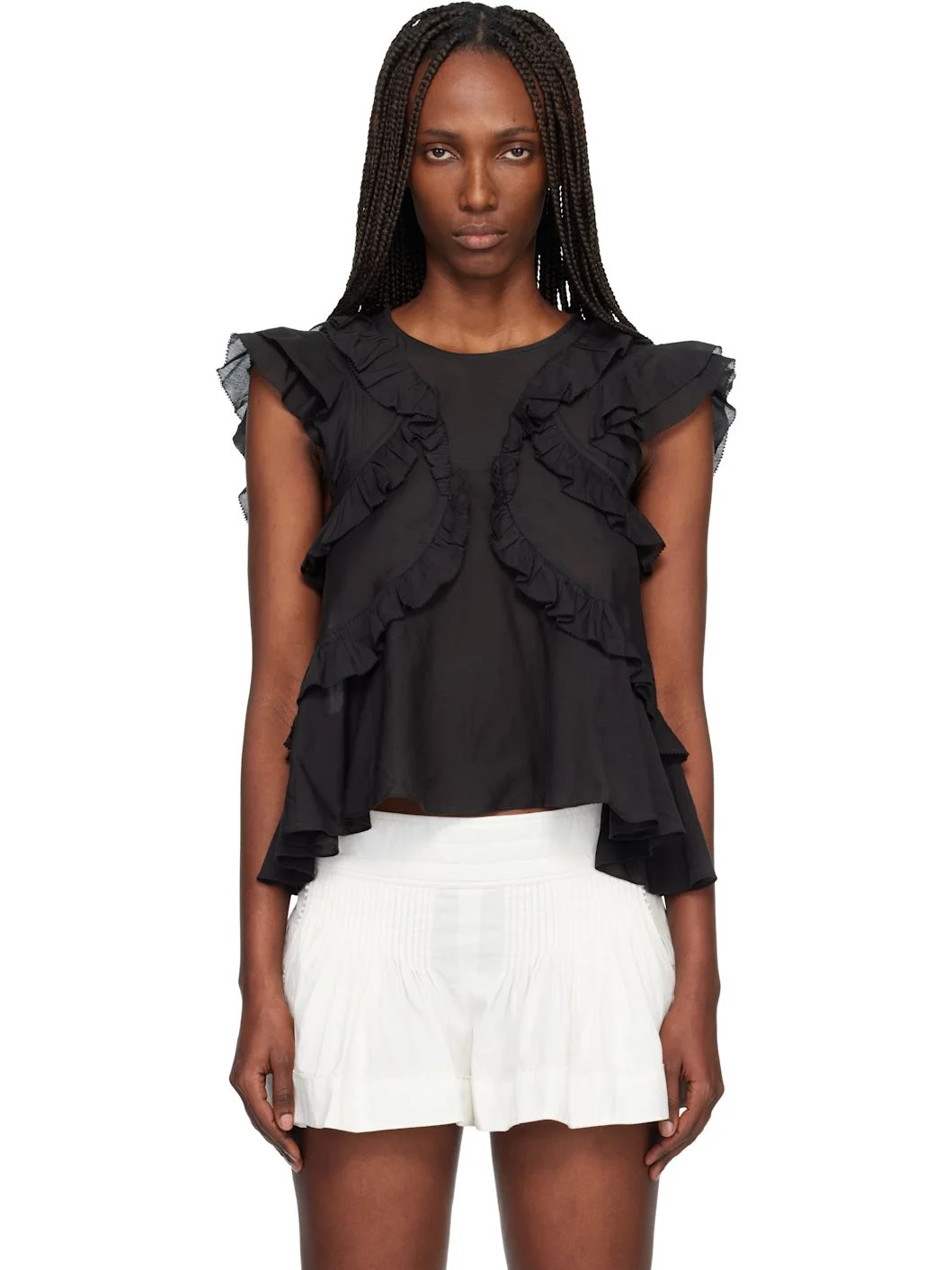 Semi-sheer cotton-blend voile blouse. · Ruffled trim throughout · Crewneck · Tiered cap sleeves · Keyhole button closure at back collar Supplier color: Black 80% cotton, 20% viscose. Made in India 261599F107007