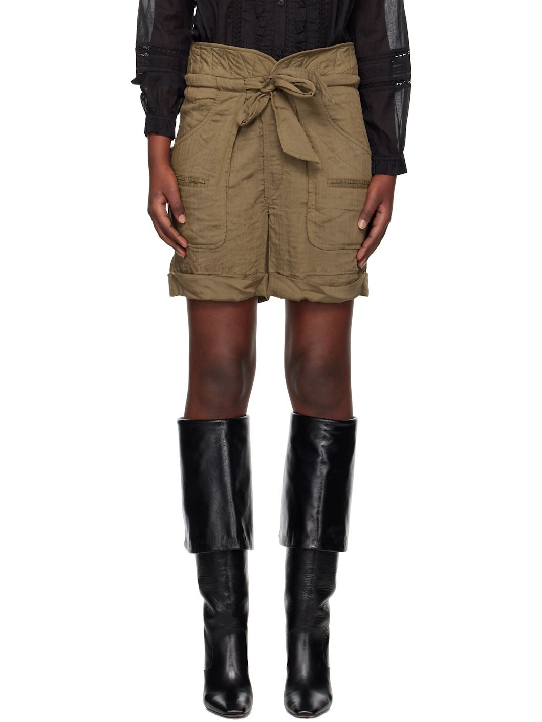 Crinkled plain-woven viscose- and organic cotton-blend shorts. · Detachable self-tie belt at quilted waistband · Four-pocket styling · Button fly · Welt pockets Supplier color: Khaki Body: 48% viscose, 29% cotton, 23% nylon. Lining: 100% cotton. Fill: 100% polyester. Made in India 251599F088005