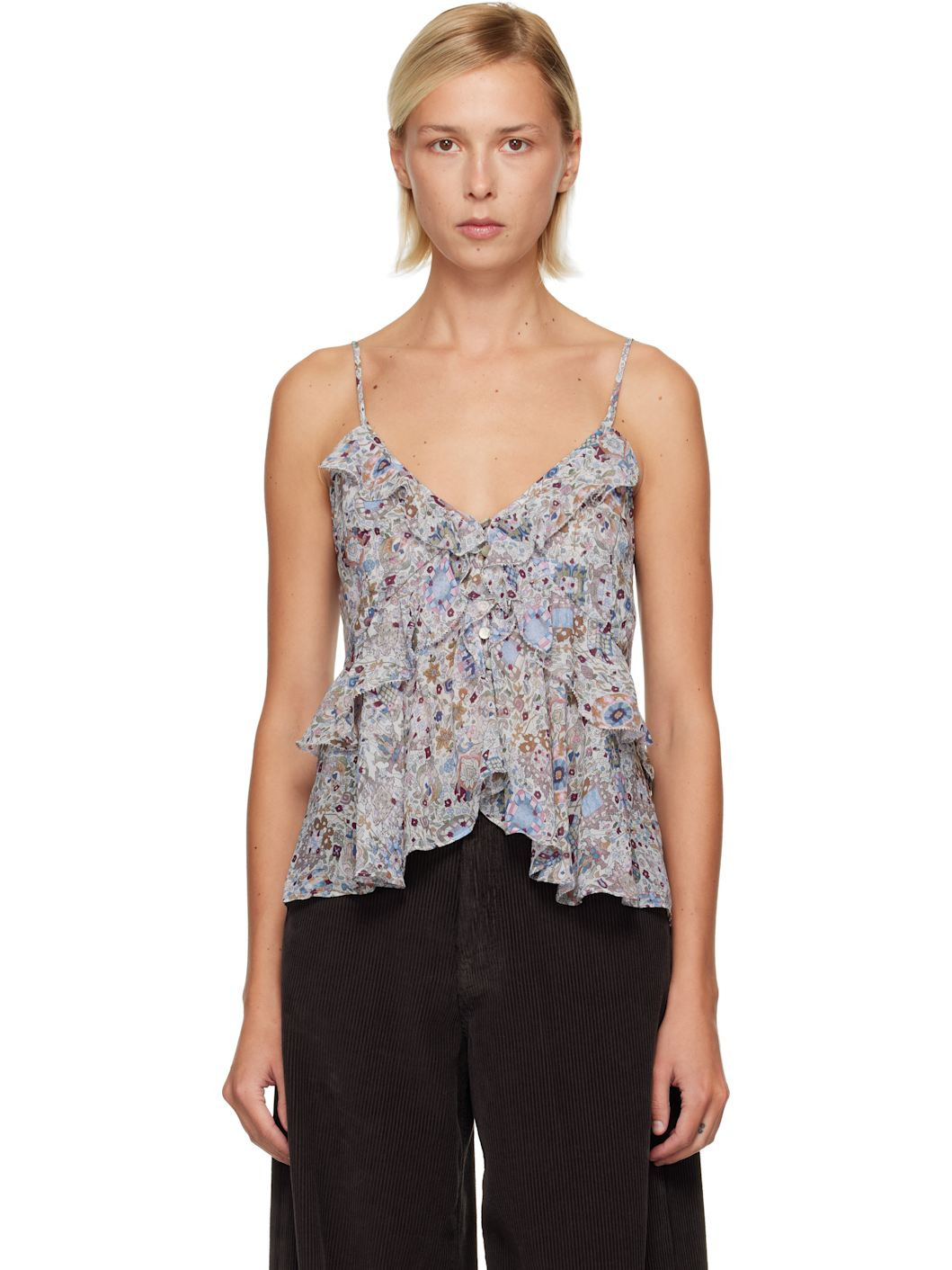 Semi-sheer viscose georgette top. · Floral pattern printed throughout · V-neck · Concealed hook-eye placket at chest · Handkerchief hem · Fixed spaghetti shoulder straps Supplier color: Ecru 100% viscose. Made in India 252599F111003