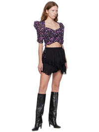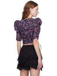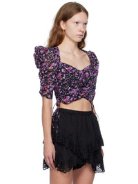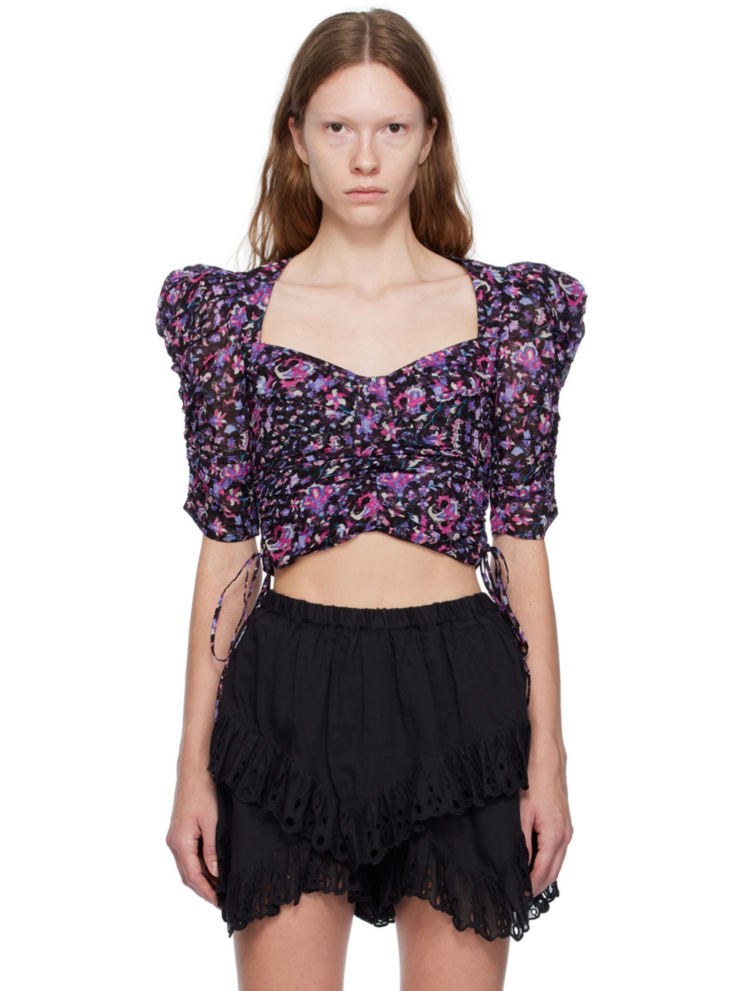 Cotton voile blouse. Gathering and floral pattern printed throughout. · Sweetheart neck · Self-tie fastening at side seams · Puff sleeves · Zip closure at back Supplier color: Midnight/Pink Body: 100% cotton. Lining 1: 100% cotton. Lining 2: 100% polyester. Made in India 232599F107004