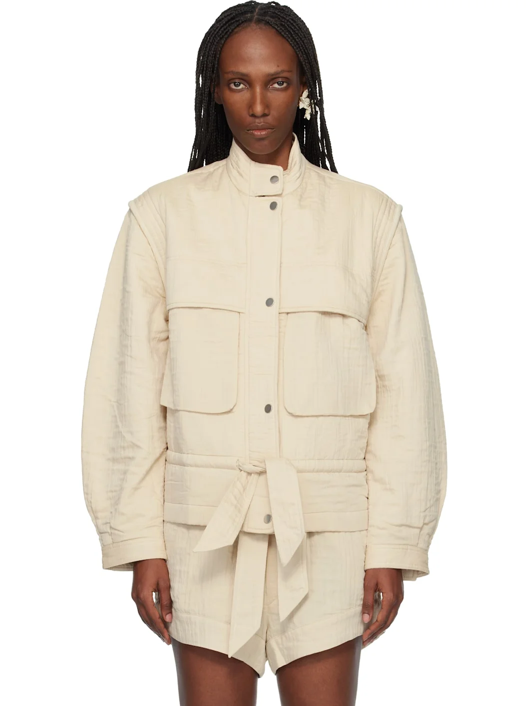 Cotton-blend double-gauze jacket. · Stand collar · Zip and press-stud closure · Press-stud pockets at chest · Self-tie drawstring at waist · Press-stud tab at cuffs · Full lawncloth lining Supplier color: Ecru Body: 48% modal, 31% cotton, 21% polyamide. Lining: 100% cotton. Made in India 261599F063001