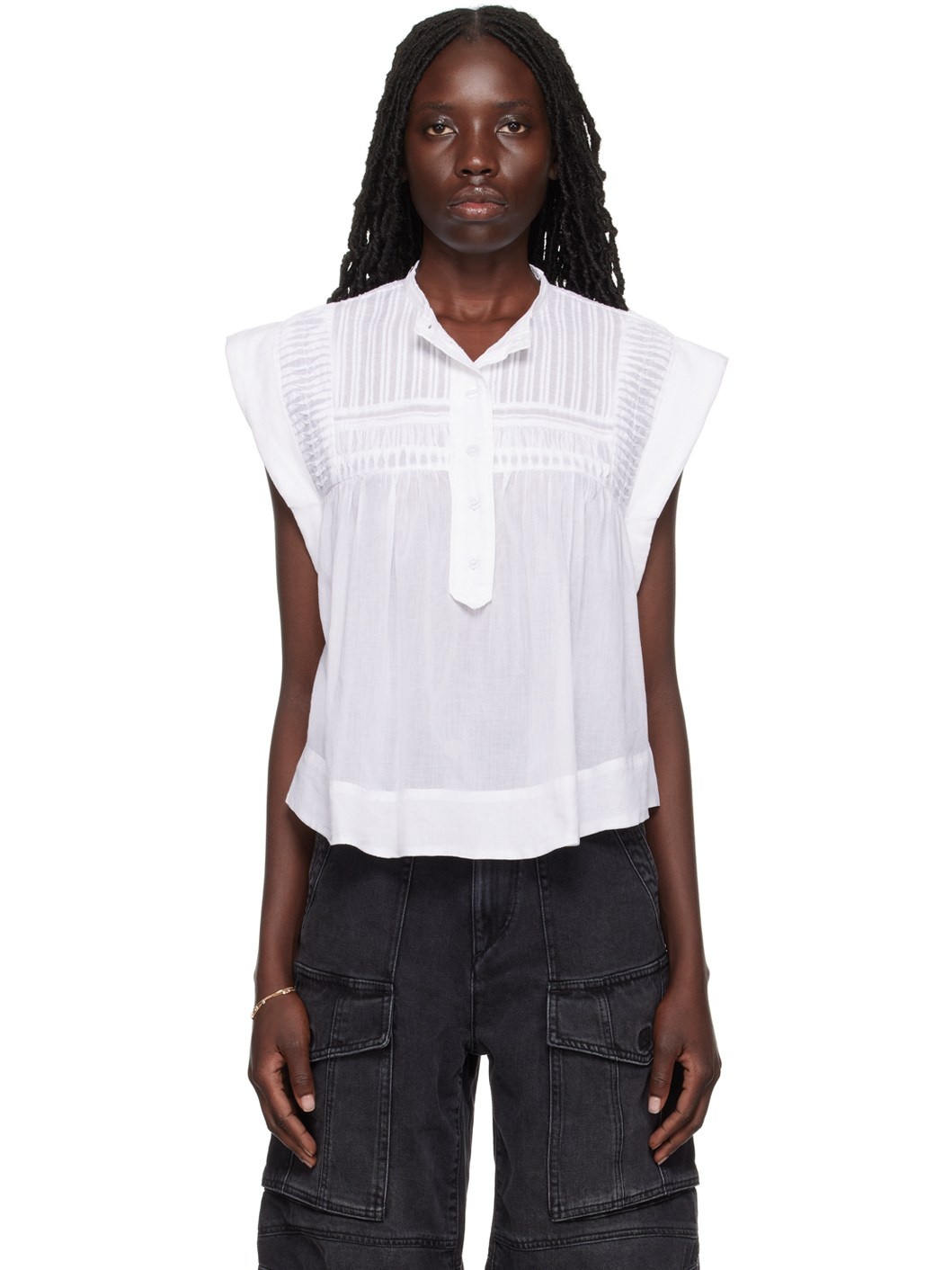 Semi-sheer organic cotton voile blouse. Pleats and gathering throughout. · Stand collar · Six-button placket · Rolled cap sleeves · Logo-engraved hardware Supplier color: White 100% organic cotton. Made in India 241599F107007