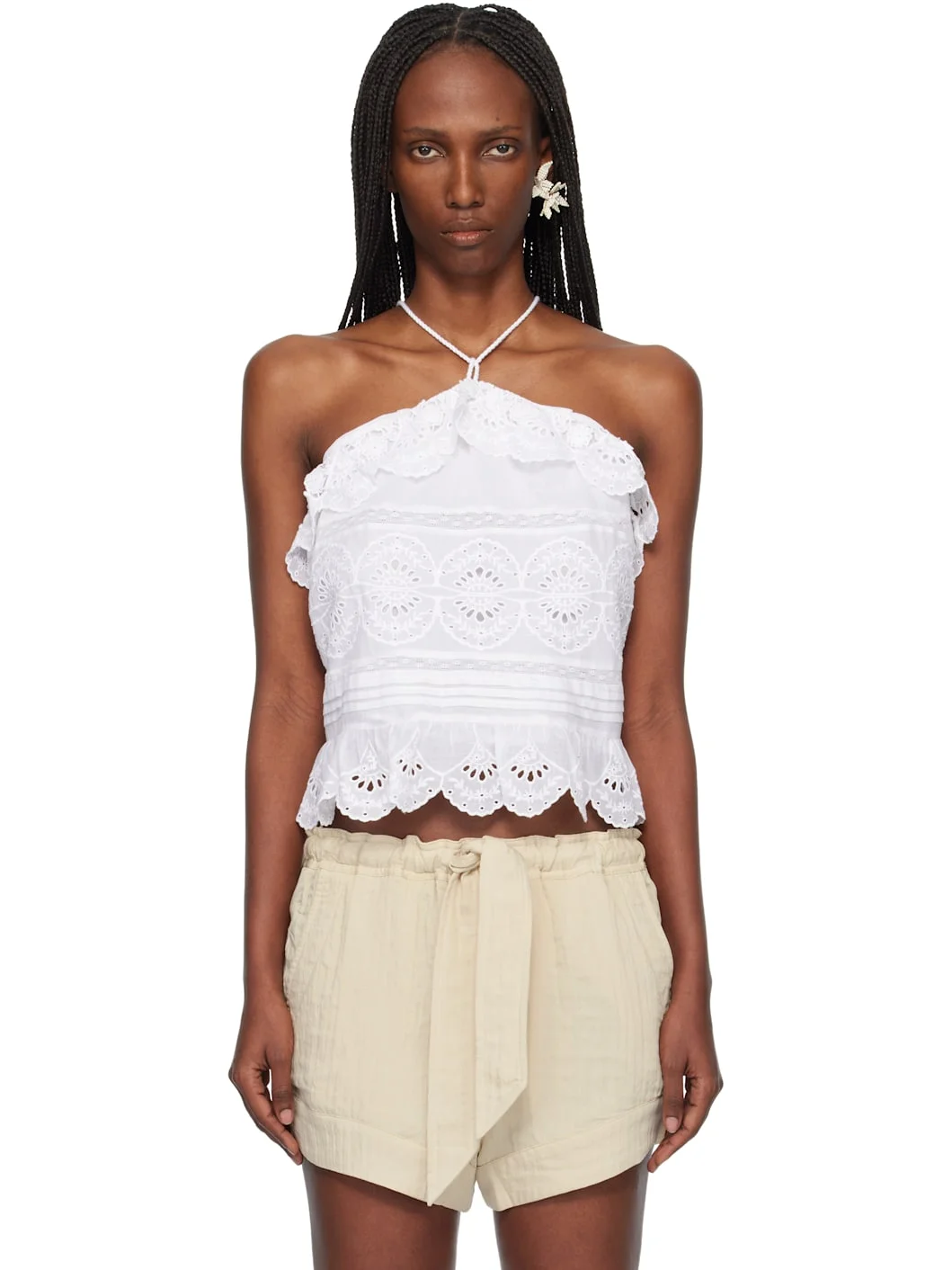 Organic cotton voile top. · Broderie anglaise detailing and pintucks throughout · Halter straps · Chiffon lining Supplier color: White 100% organic cotton. Made in India 261599F111003