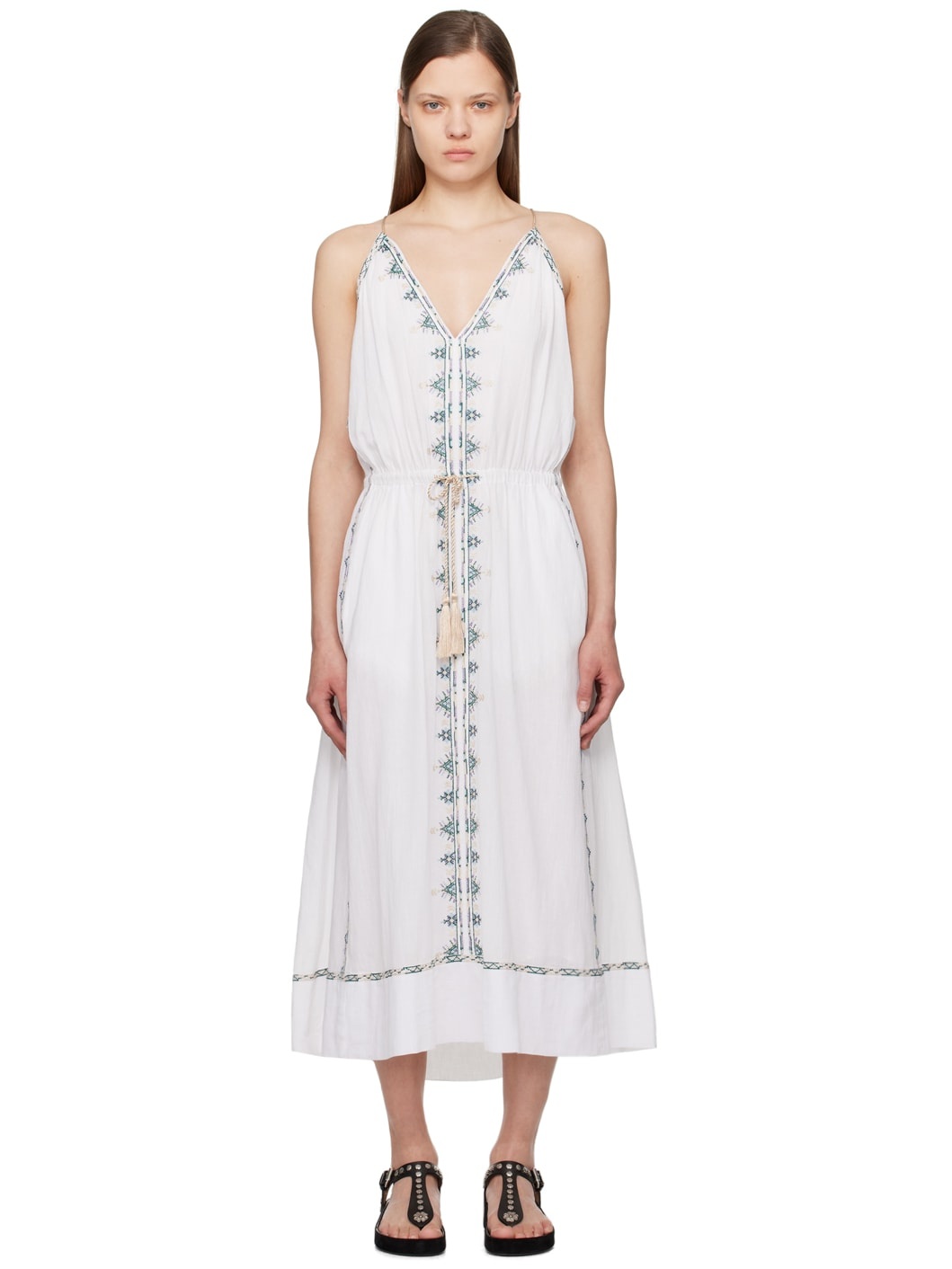 Cotton gauze dress. Floral embroidered detailing throughout. · Self-tie plunging V-neck and belt · Button fastening and keyhole cutout at racer back · Full viscose georgette lining Supplier color: White Body: 100% cotton. Trim: 100% viscose. Lining: 100% viscose. Made in India 241599F054000