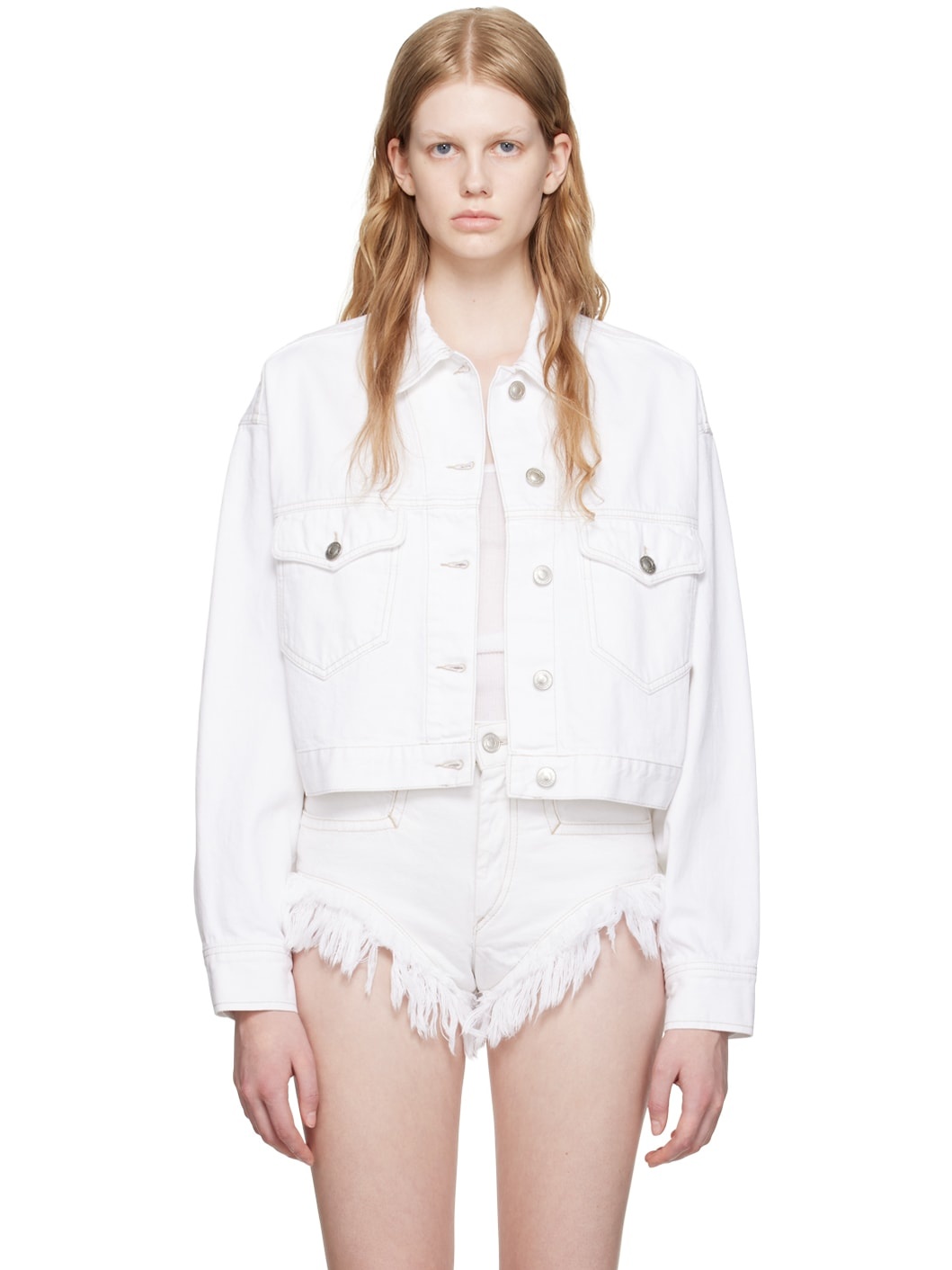 Non-stretch denim jacket. · Spread collar · Button closure · Patch pockets · Adjustable single-button cuffs · Adjustable button tabs at cropped hem · Logo-engraved silver-tone hardware · Contrast stitching in beige Supplier color: White 100% cotton. Made in Morocco 231599F060000