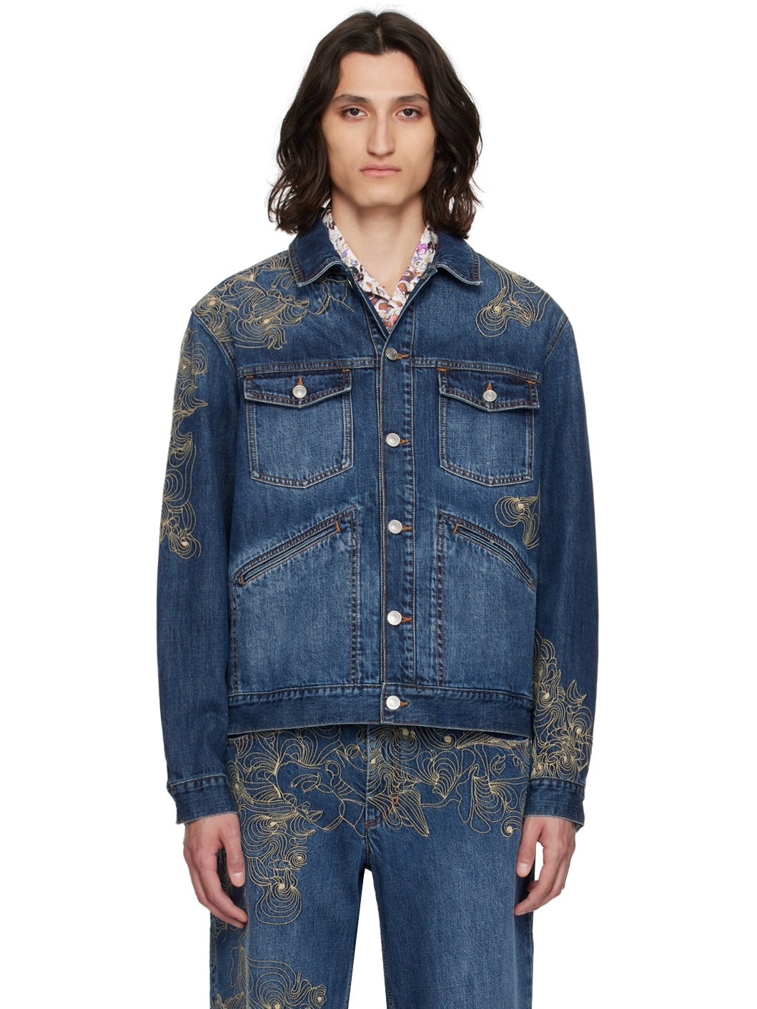 Non-stretch denim jacket. Fading and graphic pattern embroidered throughout. · Spread collar · Button closure · Flap and welt pockets · Single-button barrel cuffs · Leather logo patch at back hem · Adjustable button tabs at back hem · Logo-engraved silver-tone hardware · Contrast stitching in tan Supplier color: Blue Body: 100% cotton. Lining: 65% polyester, 35% cotton. Made in Tunisia 241600M177011