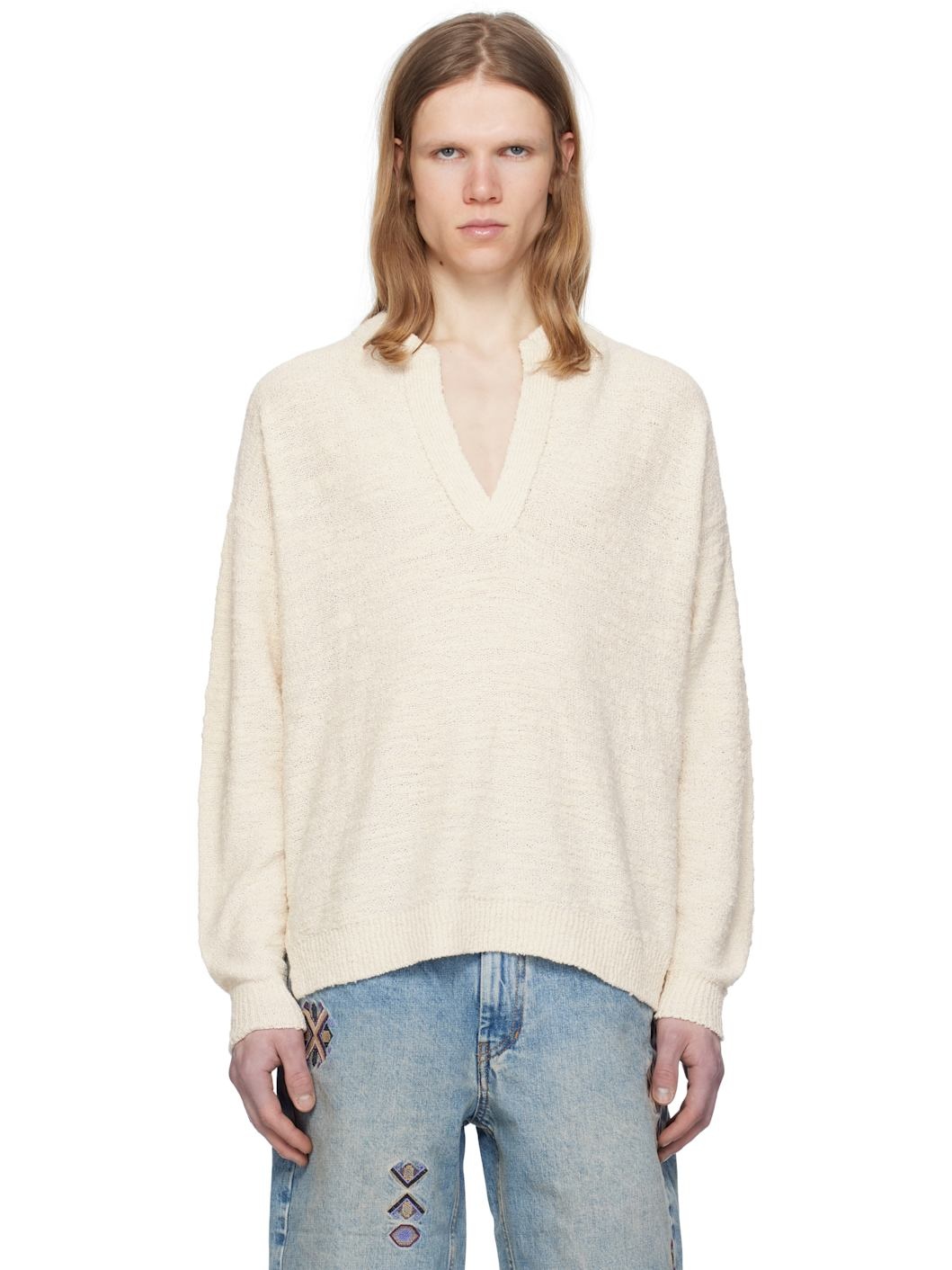 Knit cotton- and nylon-blend boucle sweater. · Rib-knit crewneck, open placket, hem, and cuffs · Vent at side seams · Dropped shoulders Supplier color: Ecru 74% cotton, 26% polyamide. Made in Italy 251600M212005