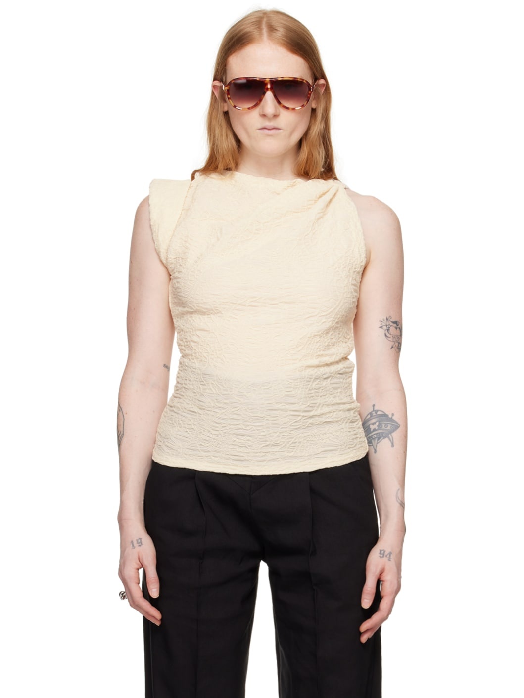 Stretch cotton-blend cloque T-shirt. · Asymmetrical construction · Boat neck Supplier color: Ecru 56% cotton, 41% polyamide, 3% elastane. Made in Poland 241600F110000