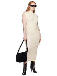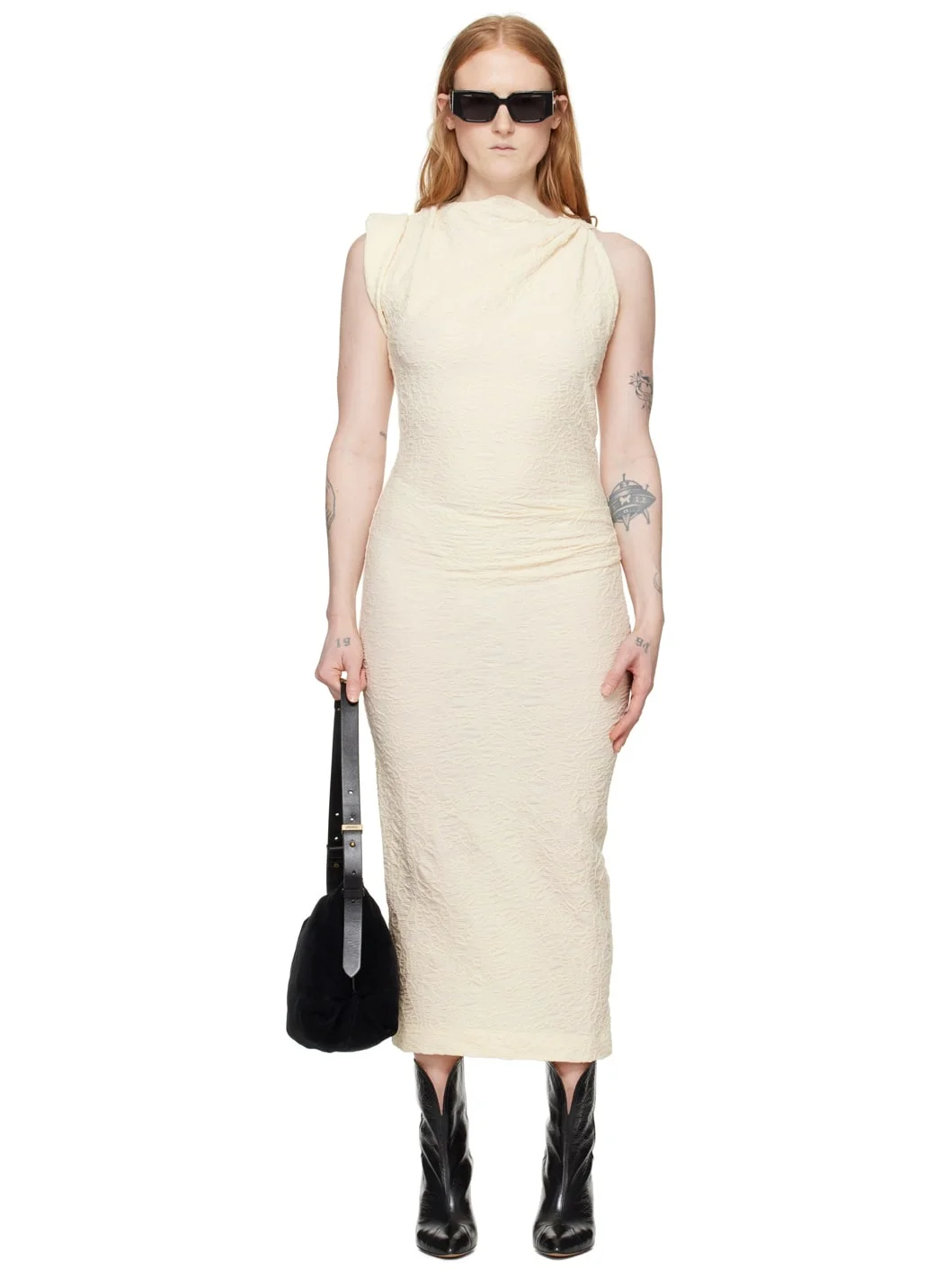 Stretch cotton- and nylon-blend cloque dress. Jacquard graphic pattern throughout. · Asymmetrical construction · Boat neck · Gathering at side seam and shoulder · Cap sleeve Supplier color: Ecru 56% cotton, 41% polyamide, 3% elastane. Made in Poland 241600F054000
