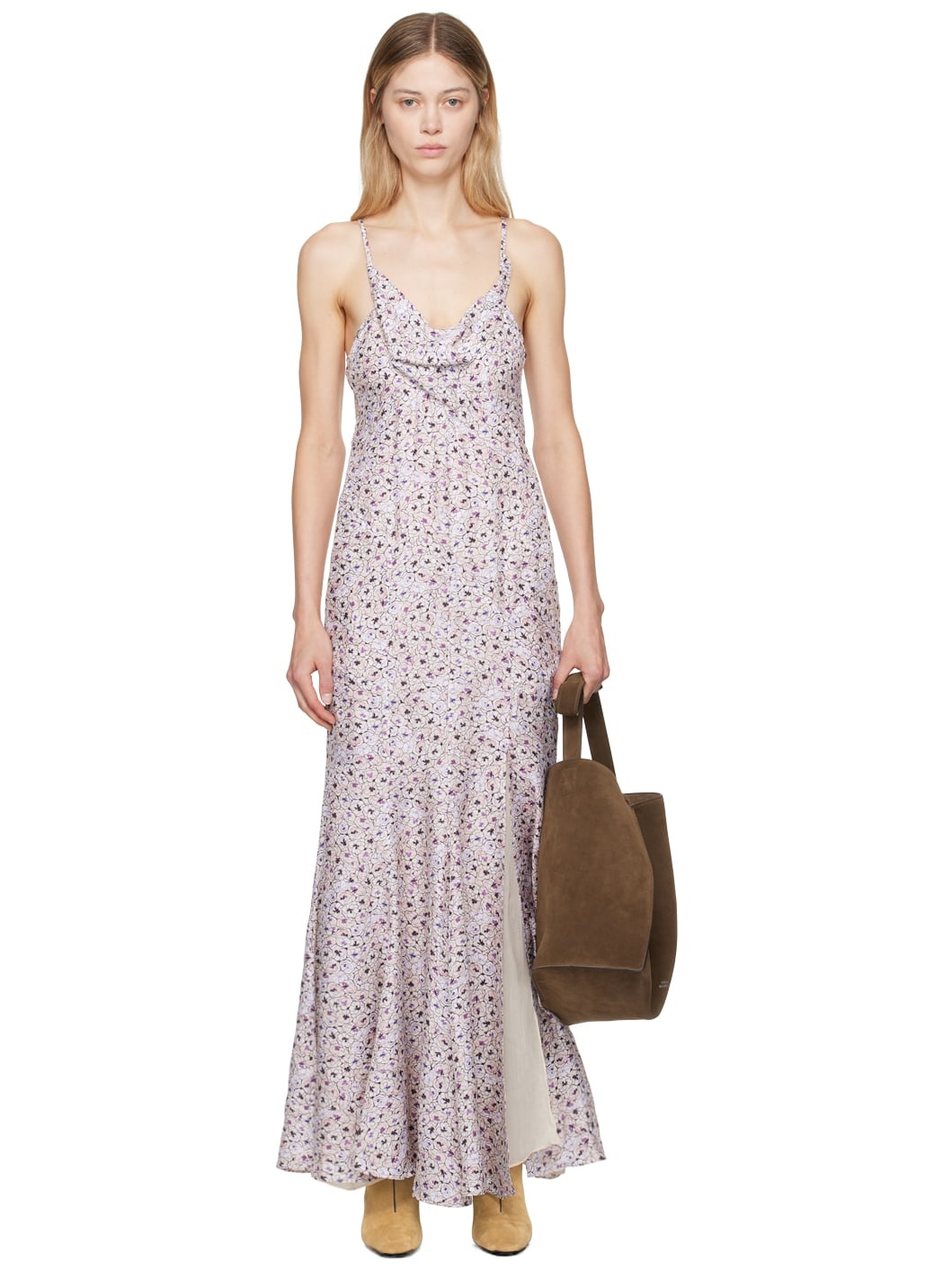 Plain-woven viscose -and silk-blend dress. Floral pattern printed throughout. · Cowl neck · Slit at front hem · Concealed zip closure at back · Spaghetti straps · Full voile lining Supplier color: Ecru Body: 70% viscose, 30% silk. Lining: 100% viscose. Made in India 242600F055000