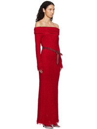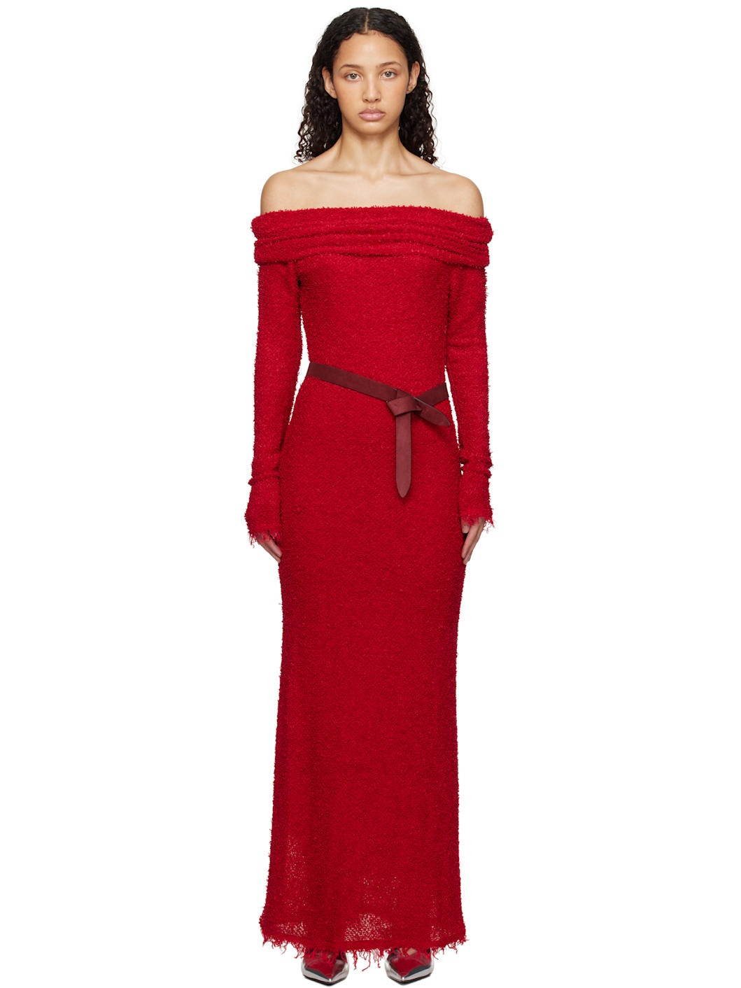 Viscose-blend boucle maxi dress. · Off-the-shoulder construction · Frayed edge at hem and cuffs · Zip closure at side seam · Partial viscose lining Supplier color: Red Body: 81% viscose, 19% nylon. Trim: 70% polyester, 30% elastane. Lining 1: 100% viscose. Lining 2: 92% viscose, 8% elastane. Made in Poland 251600F055009