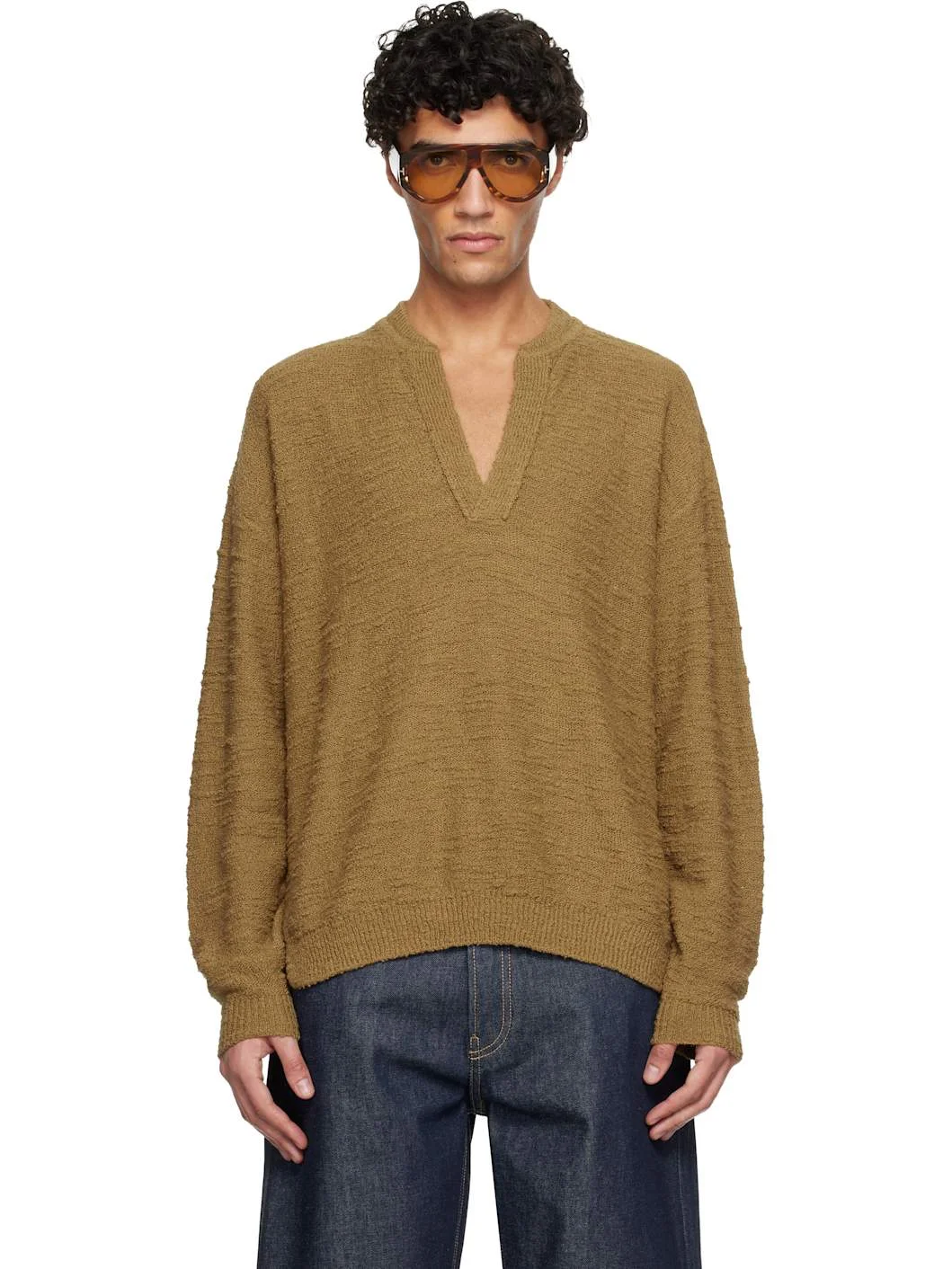 Boucle-knit cotton-blend sweater. · Rib-knit plunging V-neck, hem, and cuffs · Dropped shoulders · Vented hem Supplier color: Bronze 74% cotton, 26% polyamide. Made in Italy 261600M206001