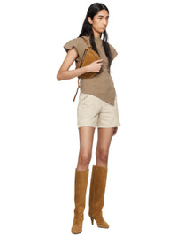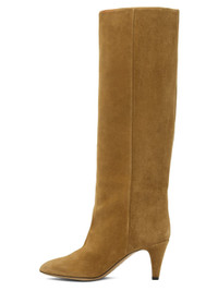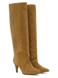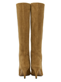 Knee-high calfskin suede boots in tan. · Pointed toe · Buffed calfskin lining · Covered stiletto heel with rubber injection · Leather sole · Heel: H3" Supplier color: Cognac Upper: calfskin. Sole: leather. Made in Italy 242600F115000