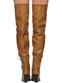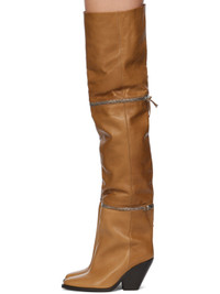Over-the-knee crinkled leather boots in tan. Detachable zip panels throughout for alternate styling. · Pointed toe · Grained leather lining · Topstitching at welt · Stacked leather block heel with rubber injection · Stacked leather sole · Heel: H3.5" Supplier color: Havana 100% leather. Made in Italy 232600F115011