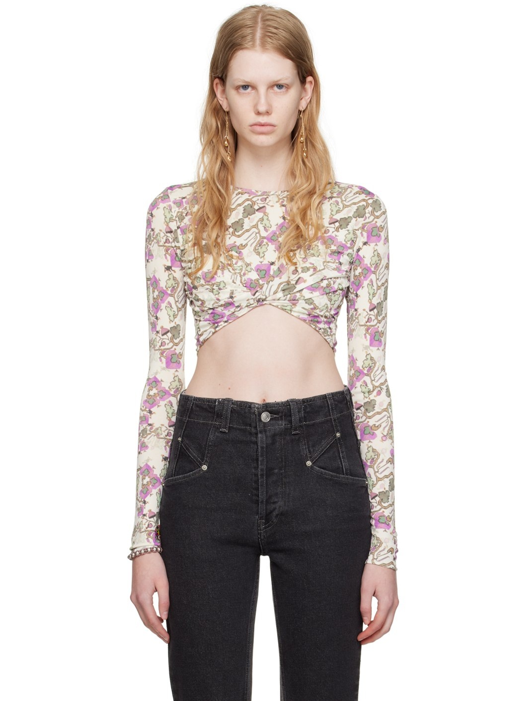 Viscose- and silk-blend jersey T-shirt. Floral pattern printed throughout. · Crewneck · Knot detail at cropped hem · Gathering at side seams Supplier color: White 80% viscose, 20% silk. Made in Portugal 231600F110001