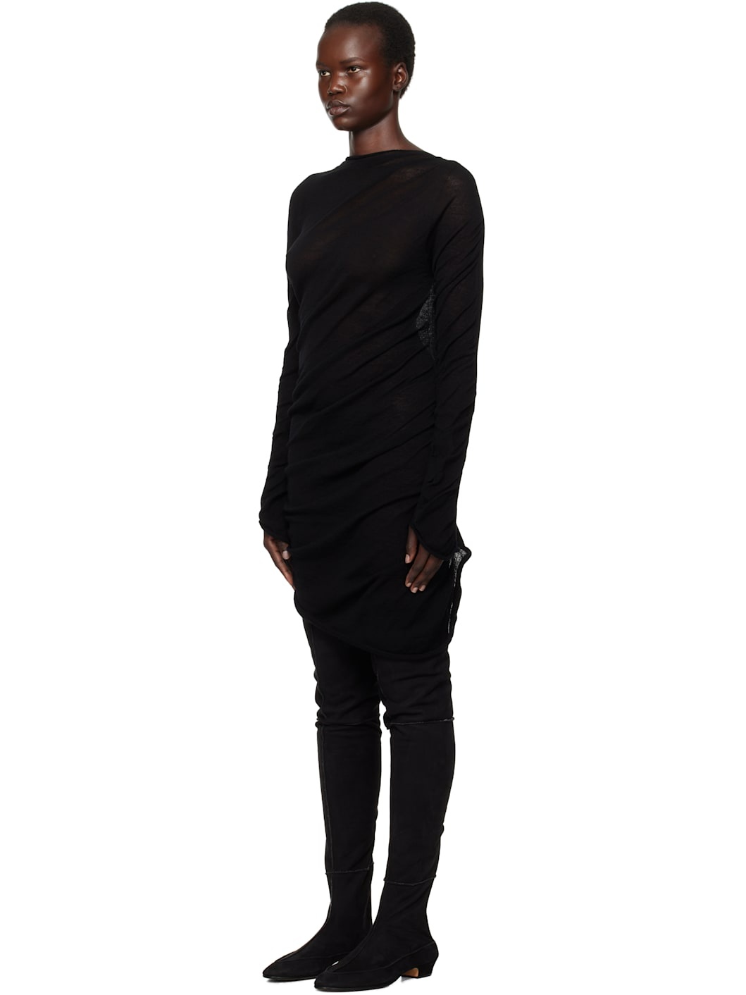 Knit wool midi dress. Draping and gathering throughout. · Boat neck · Rolled edge at hem and cuffs · Asymmetrical hem Supplier color: Black