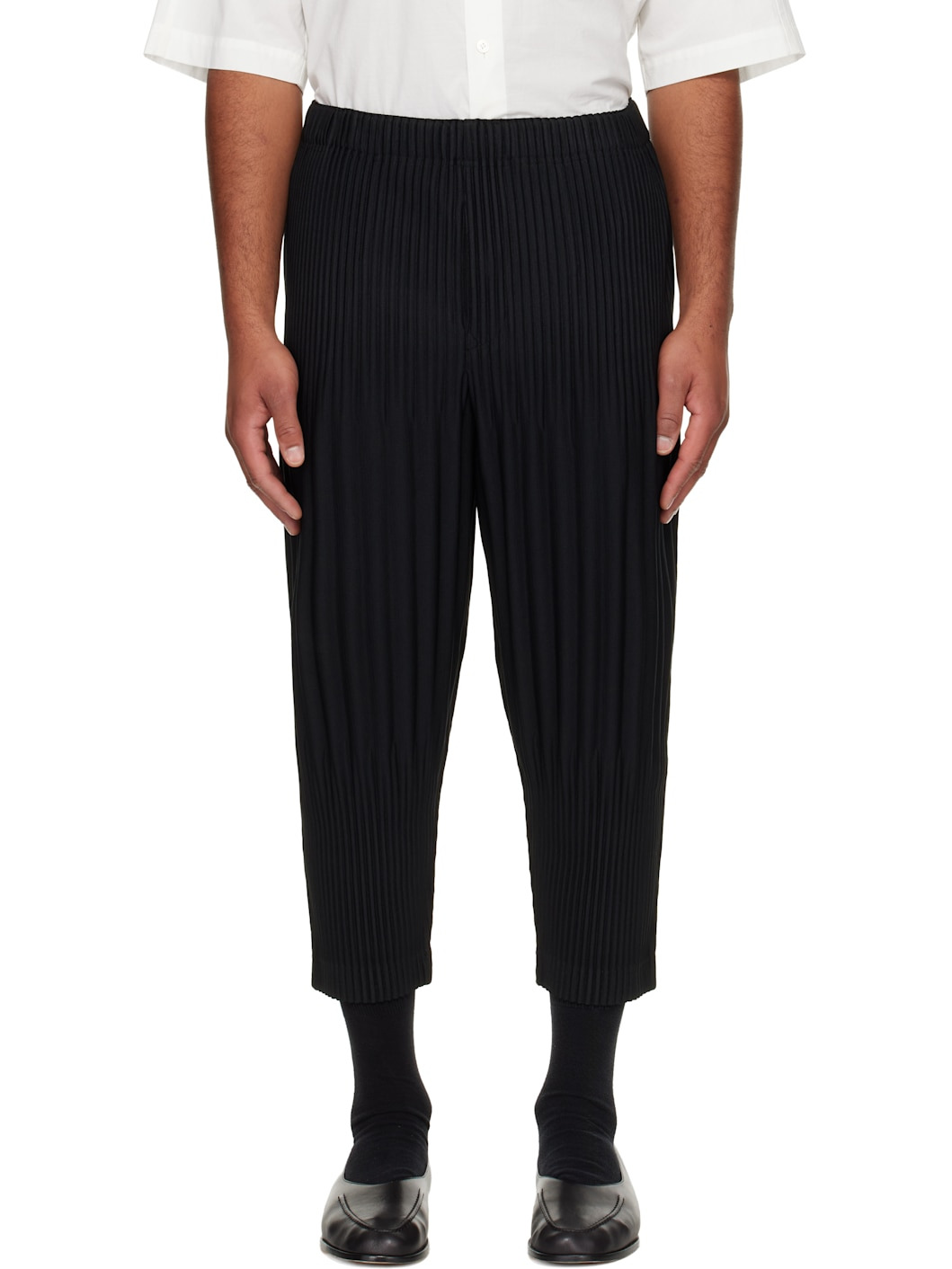 Garment-pleated tricot trousers. · Elasticized waistband · Two-pocket styling · Button fly Supplier color: Black 100% polyester. Made in Philippines 252729M191066