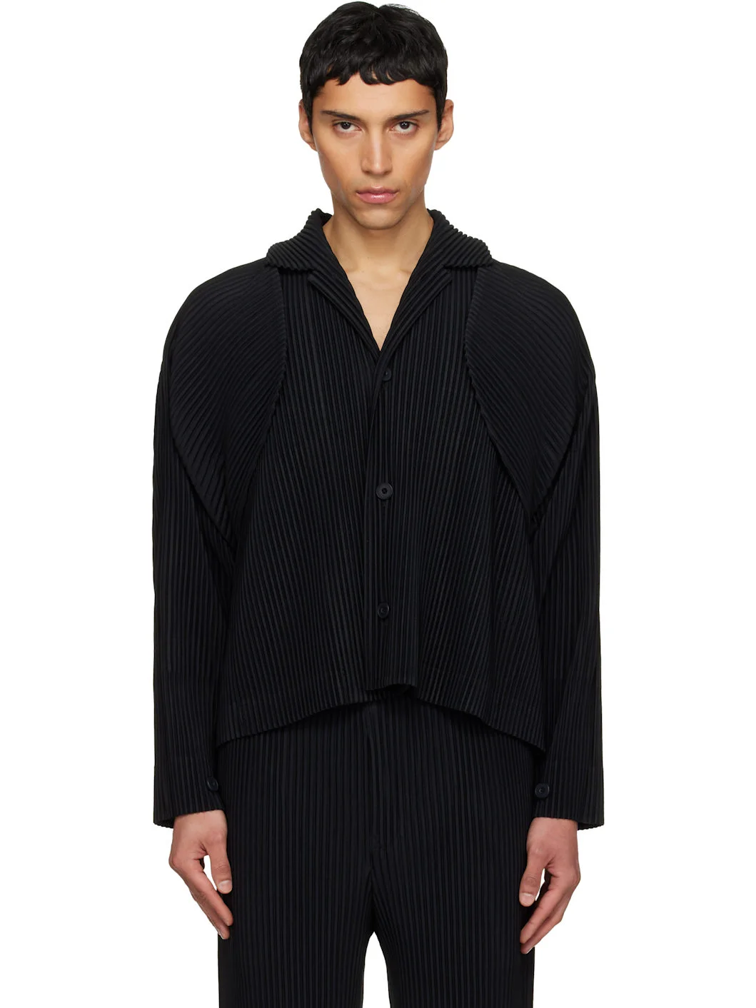 Garment-pleated tricot jacket. · Spread collar · Button closure · Seam pockets at waist · Dolman sleeves · Adjustable button fastening at cuffs · Overlay with button fastening at back · Unlined Supplier color: Black 100% polyester. Made in Philippines 261729M180018