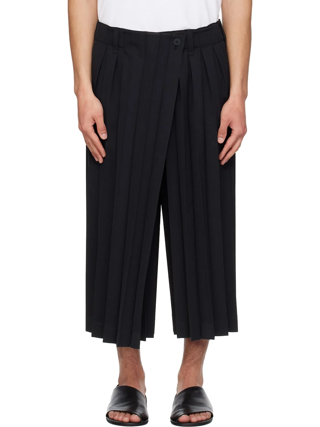 Garment-pleated twill trousers. · Wrap construction · Belt loops and button fastening at waistband · Two-pocket styling · Button fly · Cropped leg Supplier color: Black 100% polyester. Made in Philippines 261729M191048