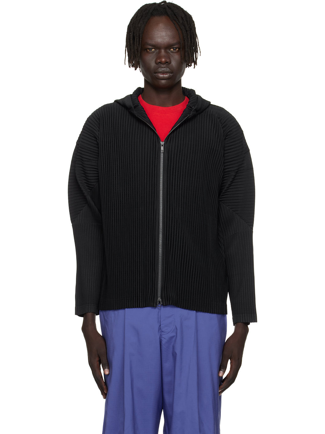 Lightweight garment-pleated tricot hoodie. · Quick-drying · Bungee-style drawstring at hood · Two-way zip closure · Seam pockets · Dolman sleeves Supplier color: Black 100% polyester. Made in Japan 252729M202001