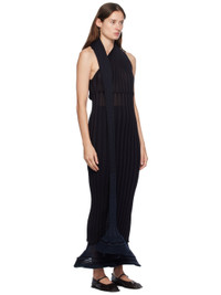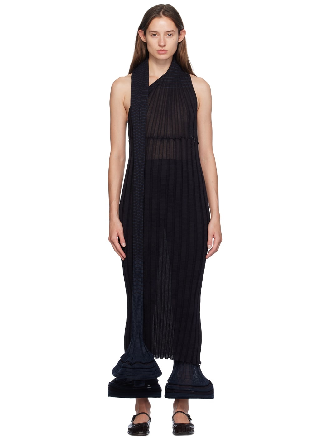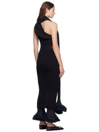 Rib knit polyester- and triacetate-blend dress. · Single-shoulder construction · Striped scarf-style trim at asymmetric neck · Lettuce edge at waist and hem Supplier color: Black hued 54% polyester, 33% triacetate, 13% ramie. Made in Japan 242809F055009