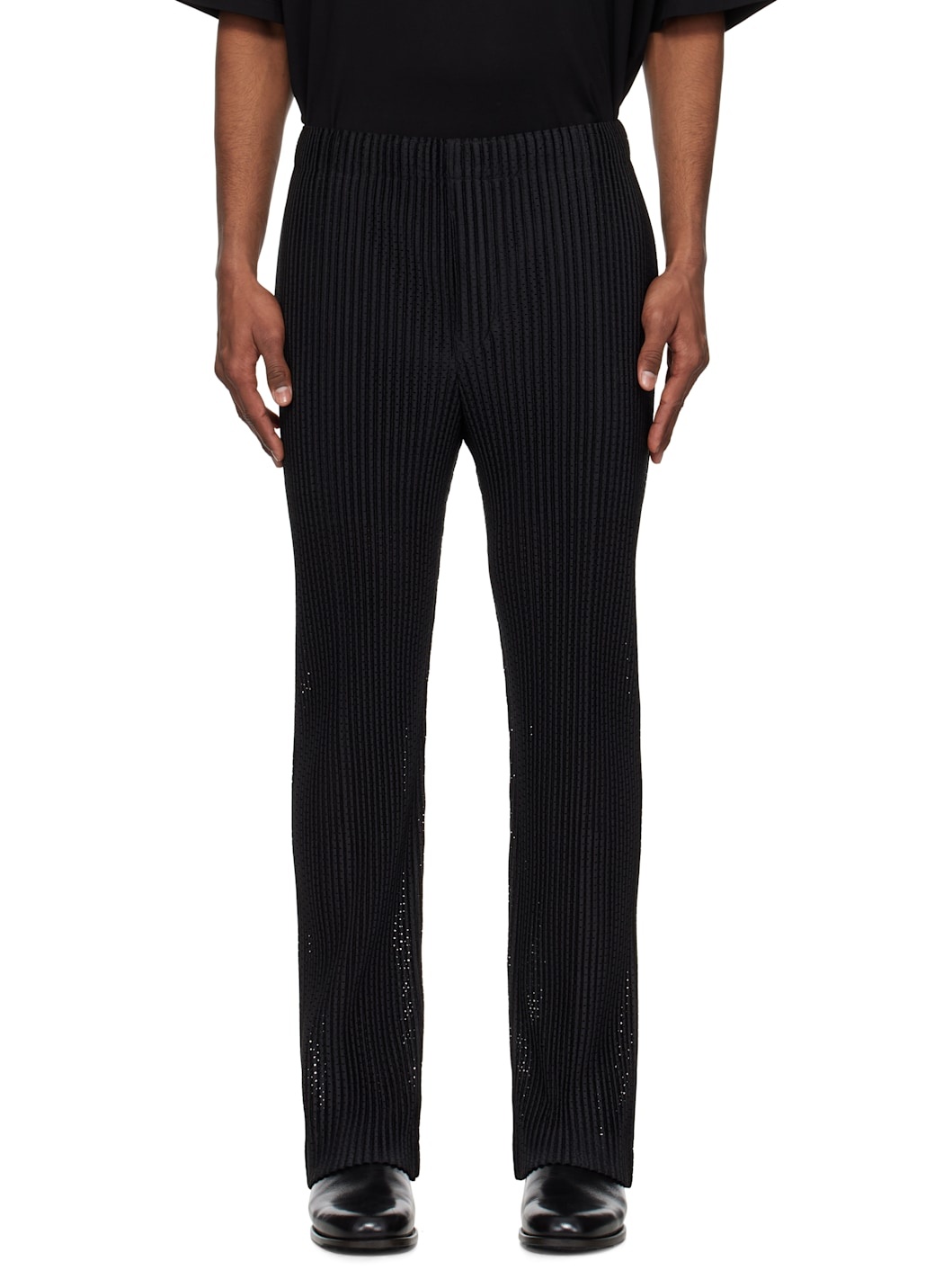Garment-pleated recycled polyester tricot trousers. Perforated detailing throughout. · Concealed drawstring at elasticized waistband · Two-pocket styling · Button fly · Vent at back cuffs · Partially lined Supplier color: Black 100% polyester. Made in Philippines 251729M191022