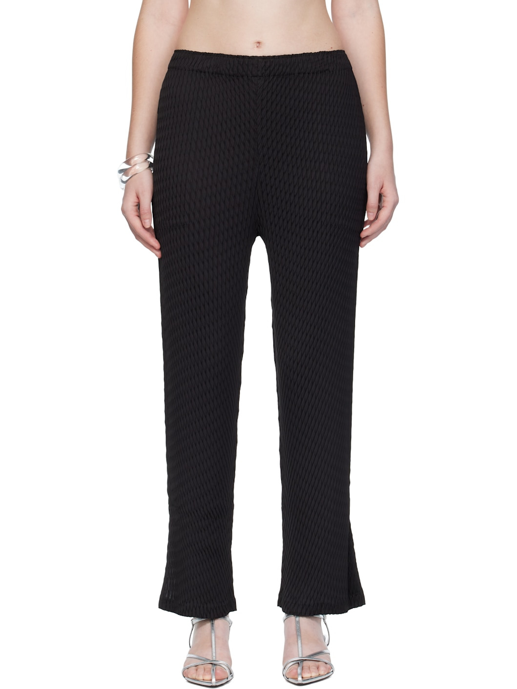 Garment-pleated tricot trousers. · Elasticized waistband · Two-pocket styling · Vented cuffs Supplier color: Black 100% polyester. Made in Japan 252809F087006