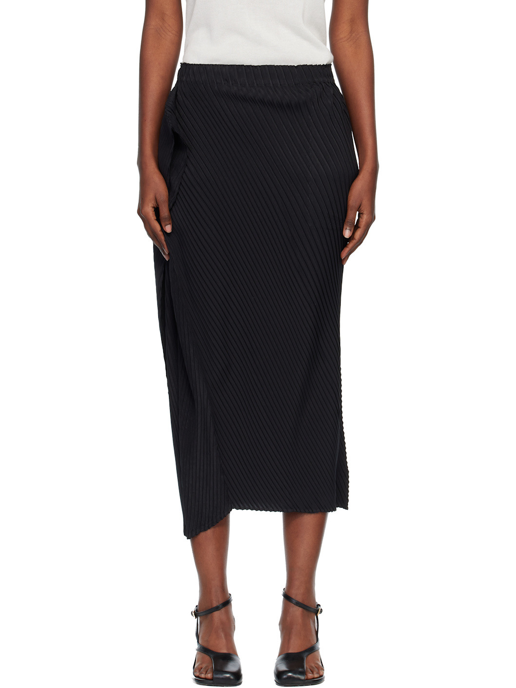 Garment-pleated recycled crepe de chine midi skirt. · Elasticized waistband · Sculptural draping at side seam Supplier color: Black 100% recycled polyester. Made in Japan 252809F092007