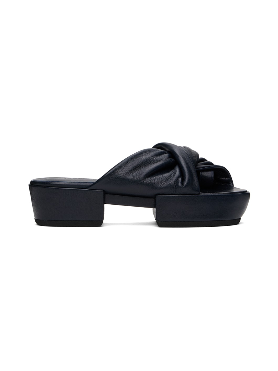 Grained leather flat sandals in black. · Open toe · Twisted thong-style strap at vamp · Logo-embossed padded buffed leather footbed · Modified covered heel and midsole · Treaded rubber sole · Platform: H1.5" · Heel: H1.75" Supplier color: Black Upper: leather. Sole: rubber. Made in Japan 241809F124000
