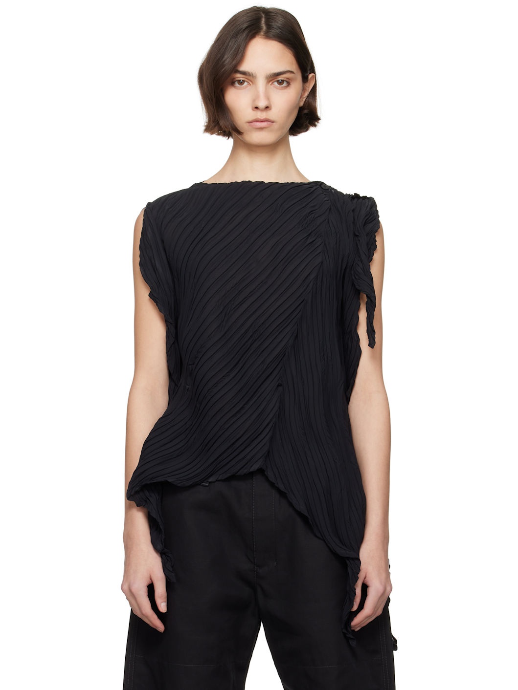 Garment-pleated polyester tricot blouse. · Asymmetric construction · Boatneck · Button fastening and extended trim at shoulder Supplier color: Black 100% polyester. Made in Japan 252809F107000