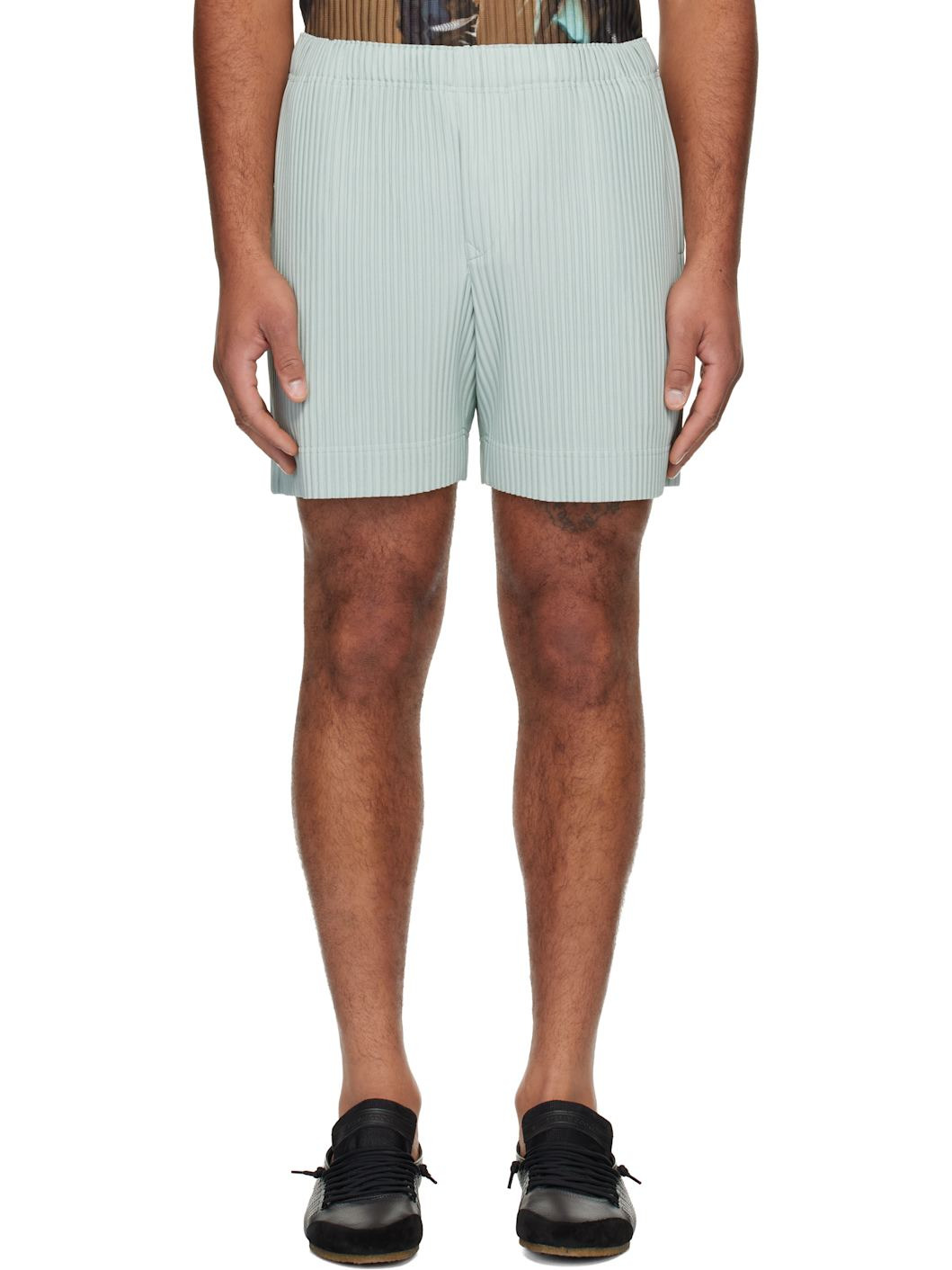 Garment-pleated polyester tricot shorts. · Concealed drawstring at elasticized waistband · Two-pocket styling · Button fly Supplier color: Sercite blue 100% polyester. Made in Philippines 252729M193009