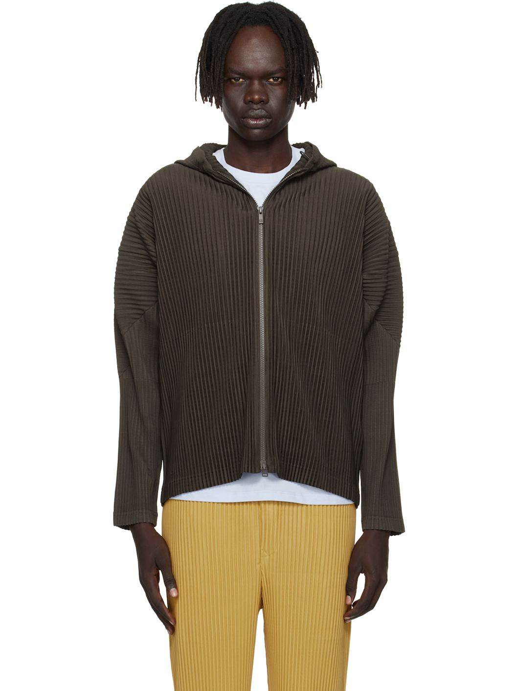 Lightweight garment-pleated tricot hoodie. · Quick-drying · Bungee-style drawstring at hood · Two-way zip closure · Seam pockets · Dolman sleeves Supplier color: Mud brown 100% polyester. Made in Japan 252729M202003