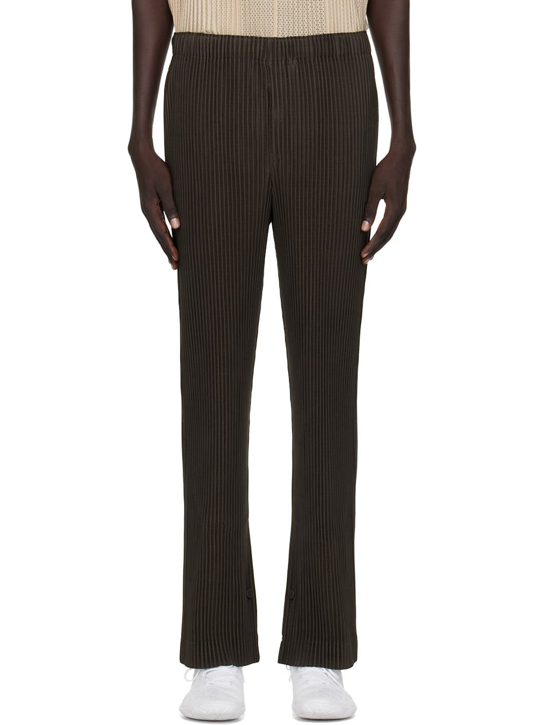 Garment-pleated tricot trousers. · Quick-drying · Straight-leg · Concealed drawstring at elasticized waistband · Two-pocket styling · Button fly · Button vent at inner cuffs Supplier color: Mud brown 100% polyester. Made in Japan 252729M191010