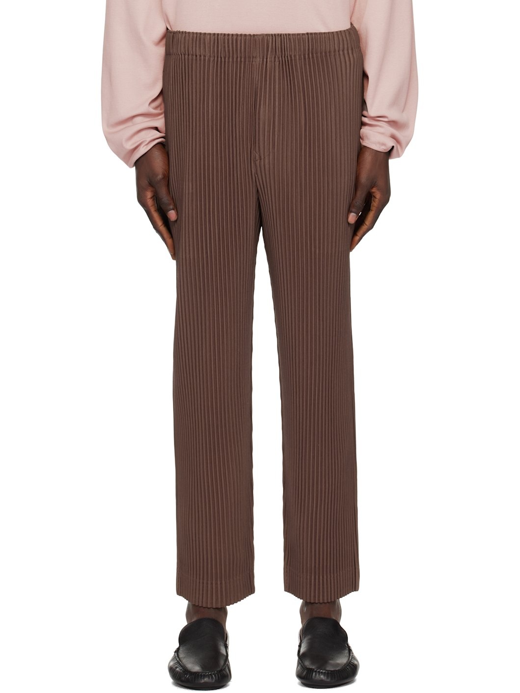 Slim-fit garment-pleated polyester tricot trousers. · Concealed drawstring at elasticized waistband · Two-pocket styling · Button-fly Supplier color: Sepia brown 100% polyester. Made in Japan 251729M191004