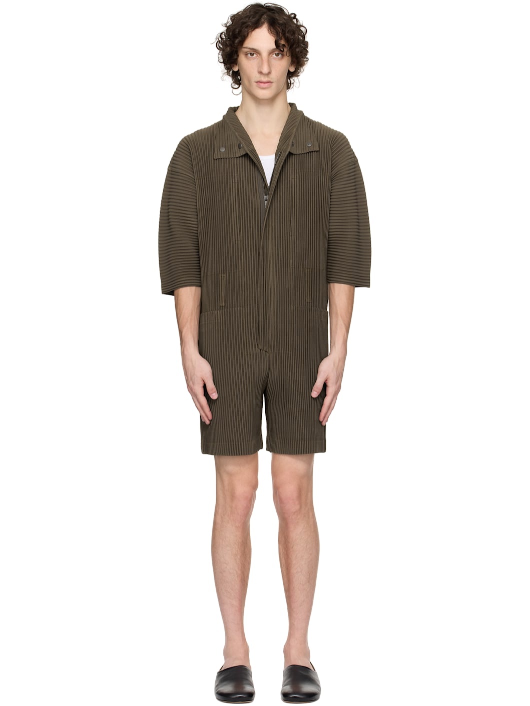Garment-pleated polyester tricot jumpsuit. · Press-stud fastening at stand collar · Zip closure · Welt pockets at chest · Belt loops · Two-pocket styling Supplier color: Sepia brown 100% polyester. Made in Japan 252729M191016