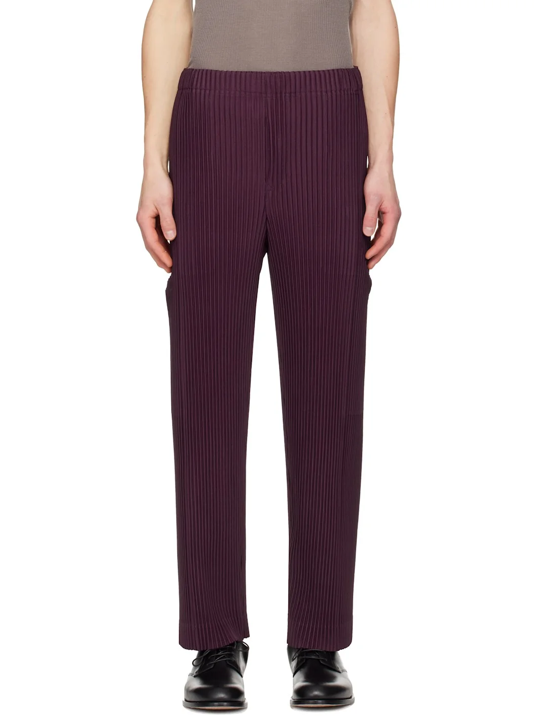 Garment-pleated tricot trousers. · Tapered · Mid-rise · Concealed drawstring at elasticized waistband · Two-pocket styling · Button fly · Patch pocket at outseams Supplier color: Wine Purple 100% polyester. Made in Philippines 261729M191015