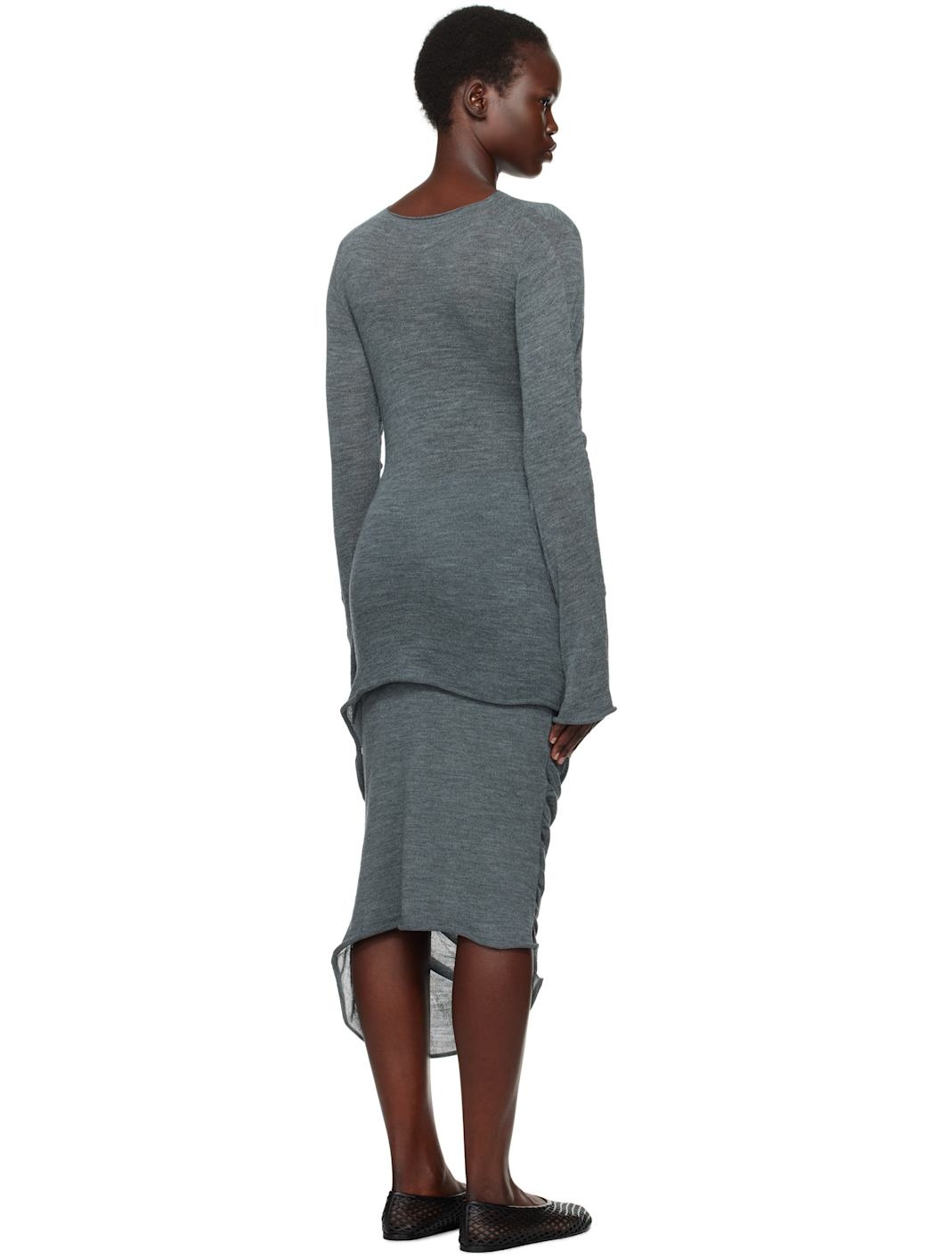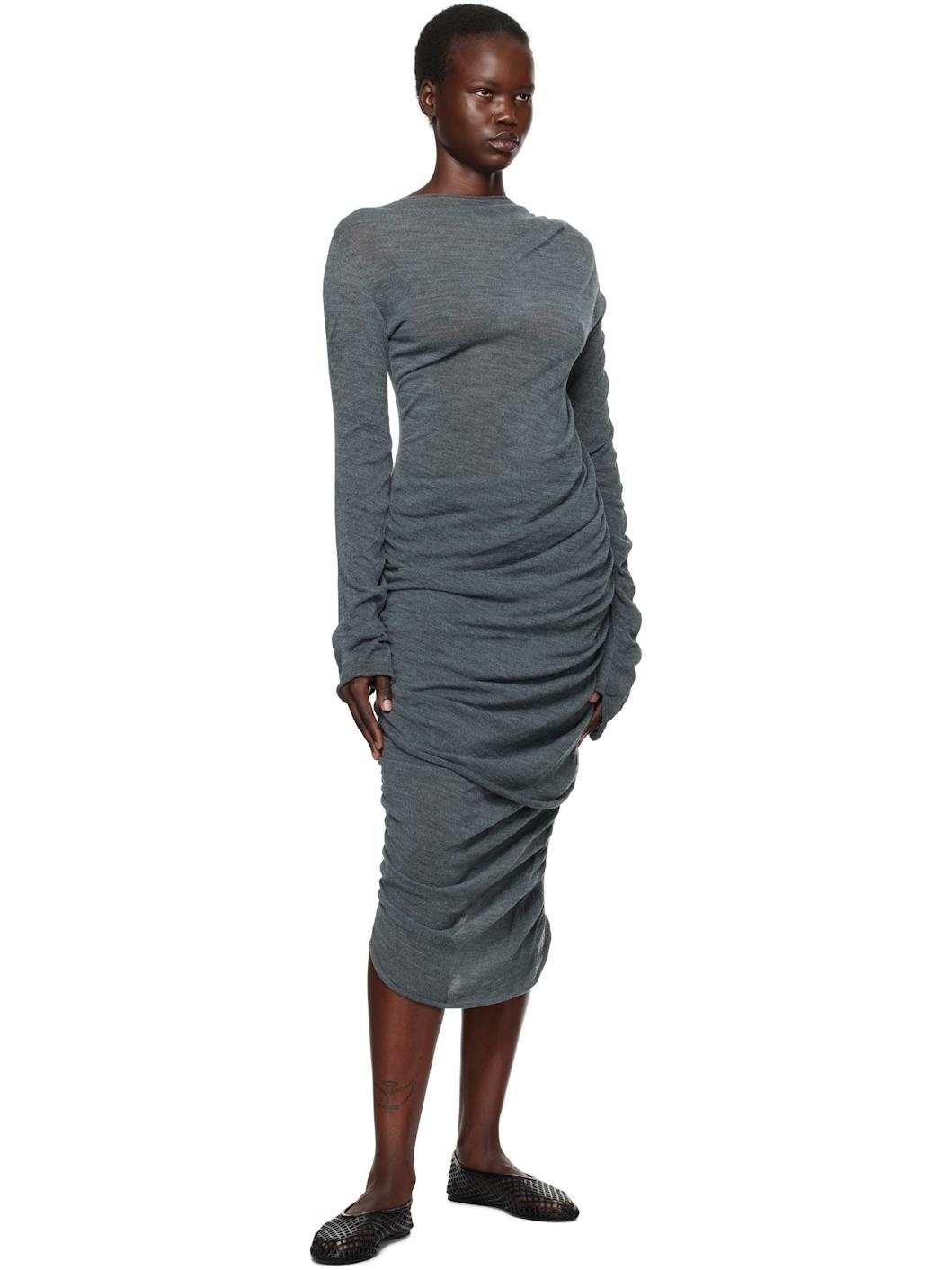 Knit wool midi dress. Draping and gathering throughout. · Boat neck · Rolled edge at hem and cuffs · Asymmetrical hem Supplier color: Drew gray