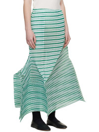Garment-pleated and semi-sheer plain-woven midi skirt. · Stripes throughout · Elasticized waistband · Sculptural asymmetric hem Supplier color: Green hued 100% polyester. Made in Japan 261809F092009