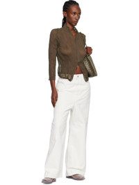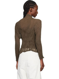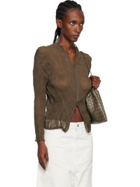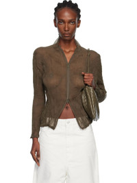 Sheer garment-pleated recycled chiffon cardigan. · Stand collar · Two-way zip closure Supplier color: Dark brown 100% recycled polyester. Made in Japan 252809F107009