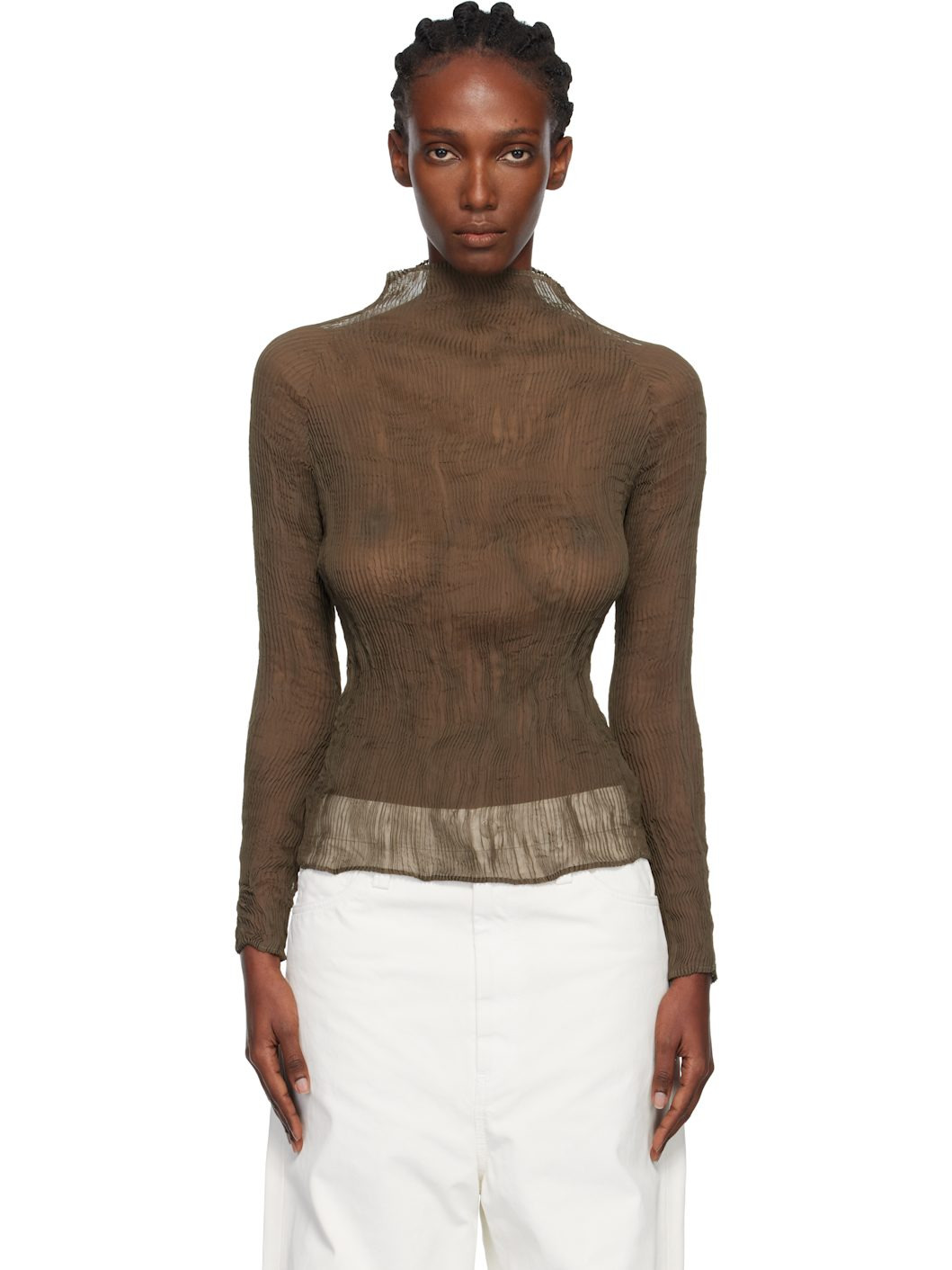 Sheer garment-pleated recycled chiffon top. · Turtleneck · Raglan sleeves Supplier color: Dark brown 100% recycled polyester. Made in Japan 252809F099023