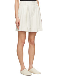 Flared grained faux-leather shorts. · Belt loops at elasticized waistband · Three-pocket styling · Mock-fly · Pleats at front · Full jersey lining Supplier color: Off white 100% polyester. Made in Japan 231809F088001